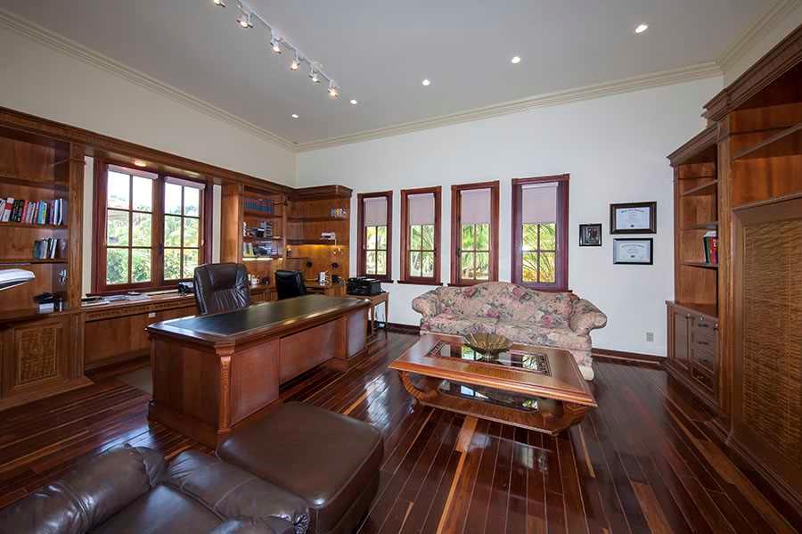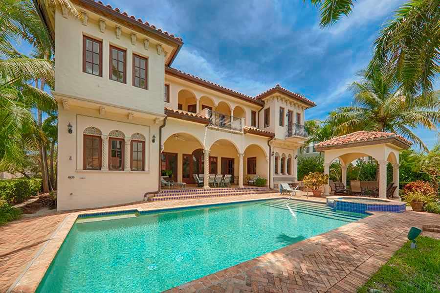 Stunning 5 BR/6.5 bath Mediterranean estate features 2 dens, large office, ample closets & balconies throughout. Greeted by a private courtyard & a 3 tier Italian fountain, this magnificent home has imported Honduras Mahogany doors, tiles handcrafted 1 by 1 in Colombia, Rojo Alicante marble floors & Comino Crespo wood detailed cabinets & furniture, gourmet custom Poggenpohl kitchen, eat in breakfast area, spacious wet bar w/custom wood finishes, pool, spa, cabana, dock, summer kitchen & 76' on the water.