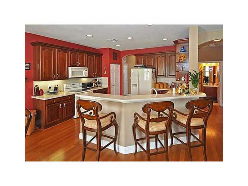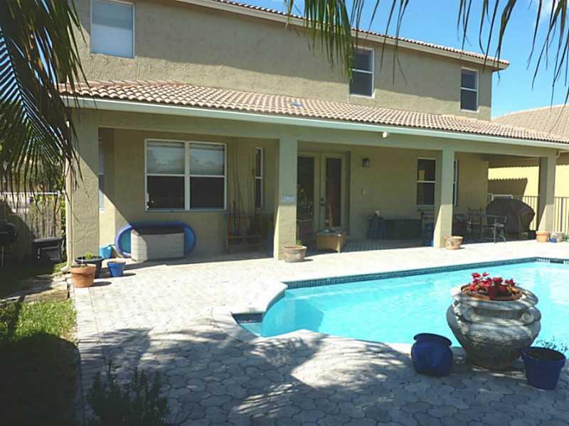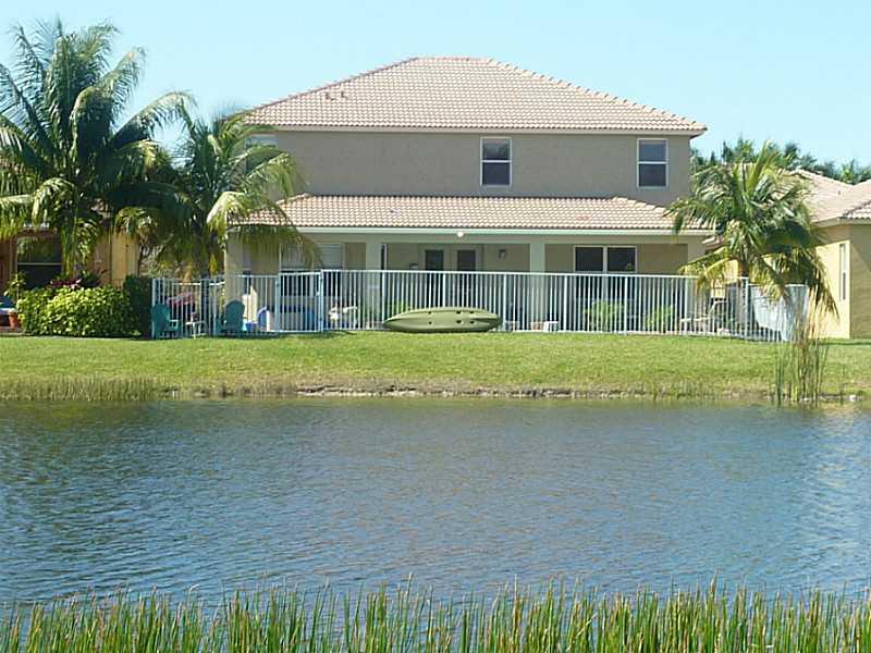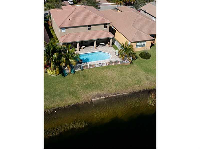Superb 5 BR, 4 bath, 3 car garage, pool, waterfront home. Waterviews fm most of home, enjoy covered patio, fenced pool, tropically landscaped yard. Gourmet eat-in kitchen with 42" wood cabinetry, corian counters. French doors, wood floors, 1 BR downstairs , master, 3 other BRs, huge loft upstairs. Big master suite incl walk-in California closets, upgraded master bath. Super location, walk to resort level community amenities, top Weston schools, close to I-75 for easy commutes in every direct.