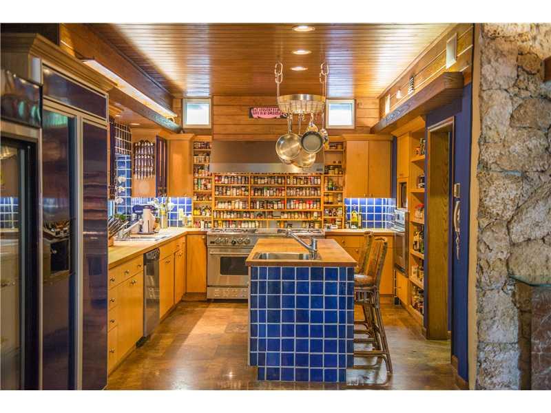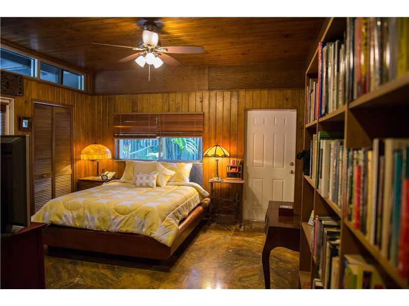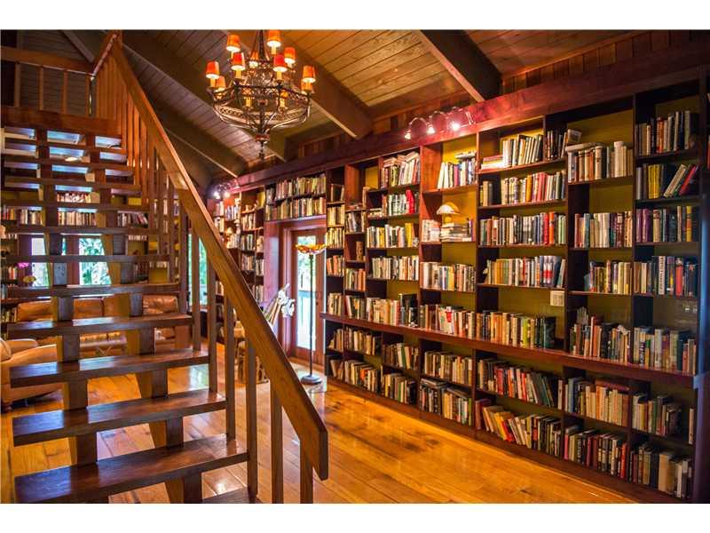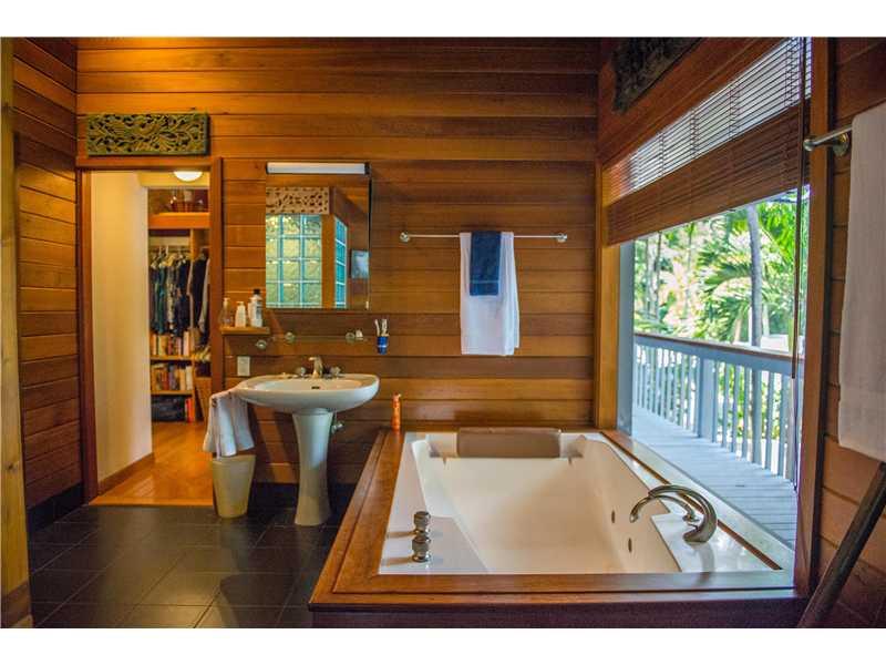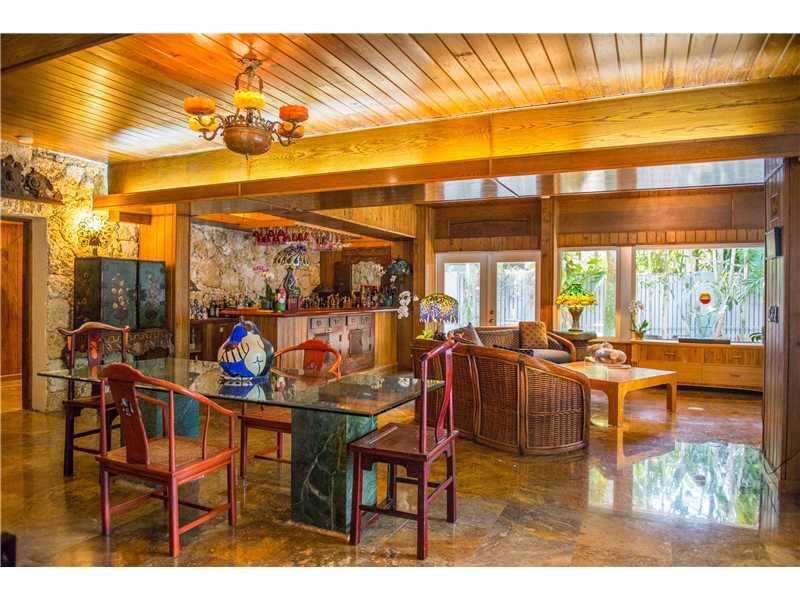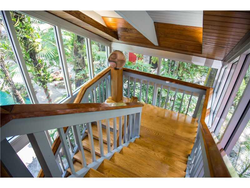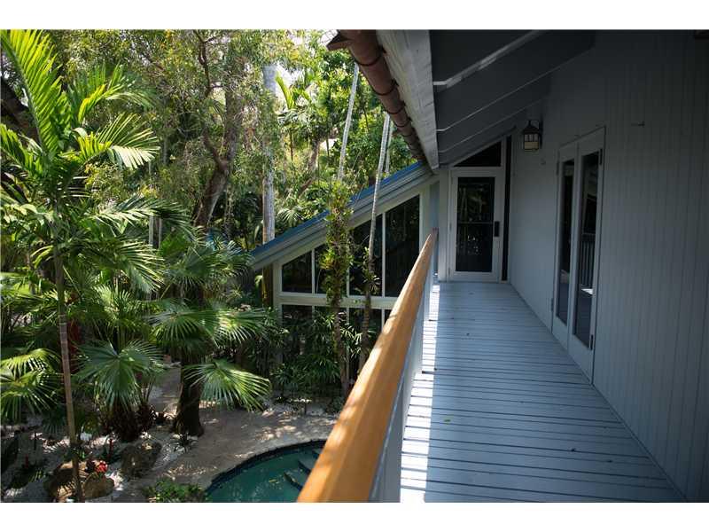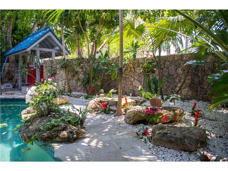 Architecturally distinctive home in prestigious guard gated Four Way Lodge Estates. Expansive living spaces overlooking tropical pool surrounded by coral rock wall for the utmost in privacy. Potential to easily reconvert to 3BR/3BA. Features include wood beamed ceilings, custom built-ins and cook's kitchen w/island & gas range. French doors open from all rooms to wrap-around porch which surrounds the homes upper level. Situated high on a coral ridge & not in a flood zone. Walk to the Grove village center.