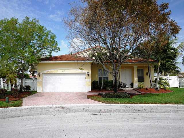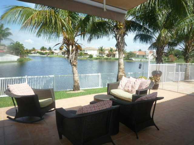 Superb 1 story, 4 bedroom, 2.5 bath waterfront, pool home on big pie-shaped, cul de sac lot in gated Palm Cove of Monarch Lakes. Upgraded throughout including gourmet kitchen with Staron solid surface counters, crown molding, closet built-ins, tile throug hout. Sliding glass doors and windows open to tropical paradisew/beautiful palms, gorgeous lake views, oversized patio perfect for entertaining, refreshing salt-water pool, covered patio w/extended awning & fenced yard. Walk to "A" rated elementary school