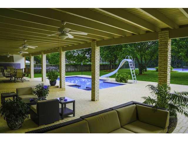 6 bedrooms + gym w/ steam room, 8.5 bathrooms, 2-car garage + covered carport, 6,600+ sq. ft. under a/c, lighted pool w/ whirlpool, North-South tennis court w/ lighting, lush deep acre lot, wood & marble flooring, granite counters in kitchen, wood volume ceilings, built-in wet bar, wine cooler storage unit, 4 a/c zones, masonry fireplace, his & hers separate master baths w/ walk-in closets & exits to privately fenced jacuzzi deck, built-in double grill in large patio area w/ luscious landscaping.