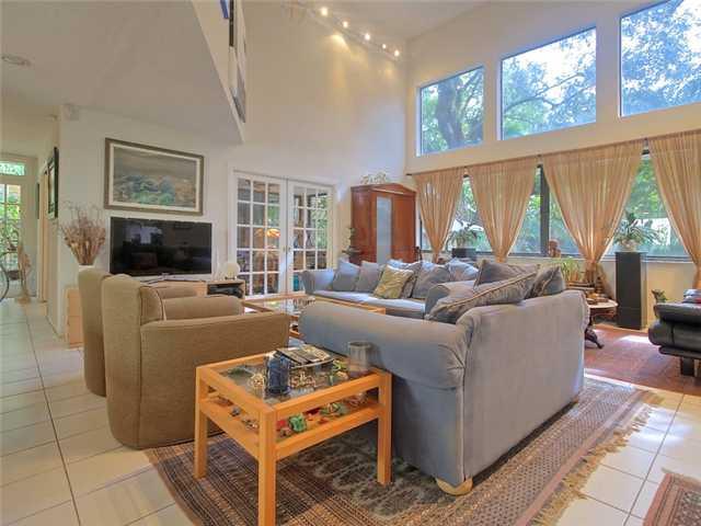 Coconut Grove! High, open ceilings, lots of light with modern open spaces. House overlooks pool and tropical gardens from all large windows. This 4/3 features a white contemporary kitchen with cooking island. 1/1 downstairs with ceramic tile floors. Woode n deck off the pool, mature oak trees all around, storage room outside. Quiet, serene and completely fenced in and gated. Square footage according to owner.
