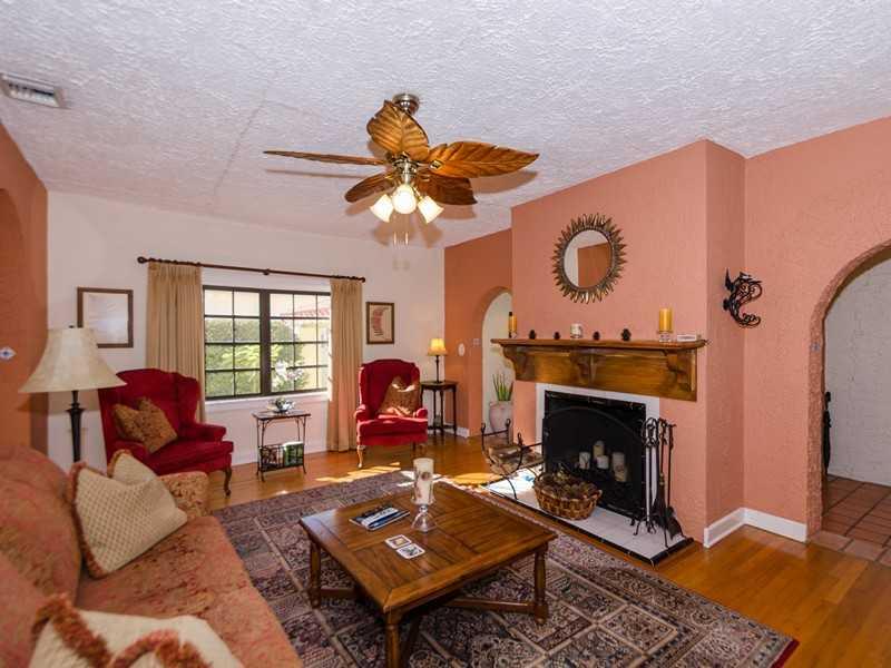 This Old Spanish home in the urban neighborhood of 'Gallery Row' is aesthetically pleasing to the eye & offers lots of colorful landscaping as a backdrop. Note the effect it will have on you as you walk throughout & find a fireplace, enclosed porch, arche s, tall ceilings, wood & clay floors, niches + a very handsome eat-in kitchen. It's floor plan is comprised of a 2/2 + den + semi-detached 1/1.