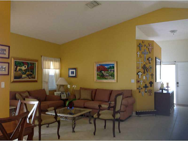 Great one story home kept in perfect condition. Fully tiled, split bedroom floor plan, remodeled bathrooms, high ceilings, totally remodeled kitchen with beautiful appliances, spacious family room, paved side yard ideal for entertaining or barbeque, acco rdion shutters, laundry room and 1 car garage.Low maintenance fee,located in excellent community and priced to sell fast. A pleasure to show.