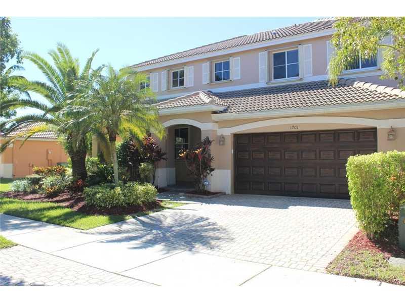Beautiful 4/2.5 with office/den adjoined to master bedroom. Located on a quiet Cul-de-sac. New salt-system, heated pool and spa, new patio, new retractable awnings, new landscaping, new laminate flooring. Newer A/C's Roof and water heater. 42" Maplewood kitchen cabinets, stainless steel appliances, double oven. Accordion Hurricane Shutters. Resort Clubhouse with 3 pools, water slide and more! This wonderful home is spacious, clean and well taken care of. A+ schools. This property is a must see.