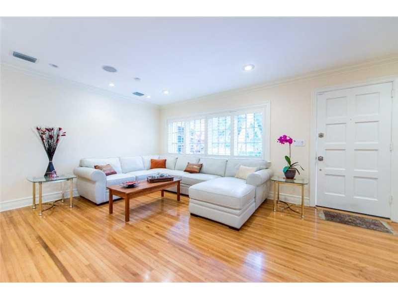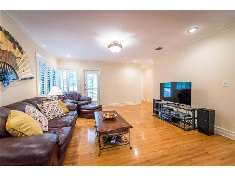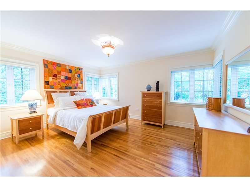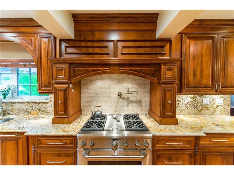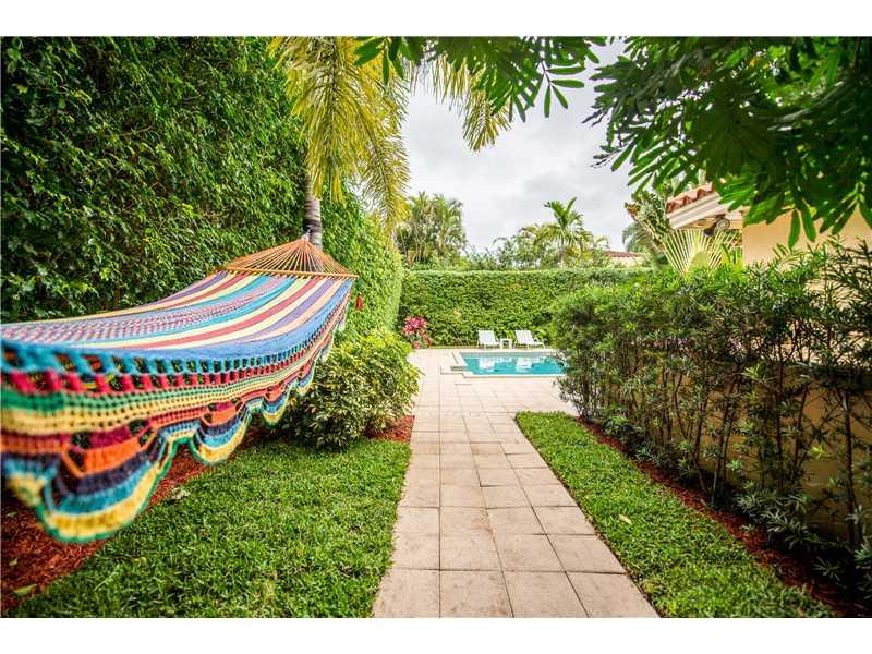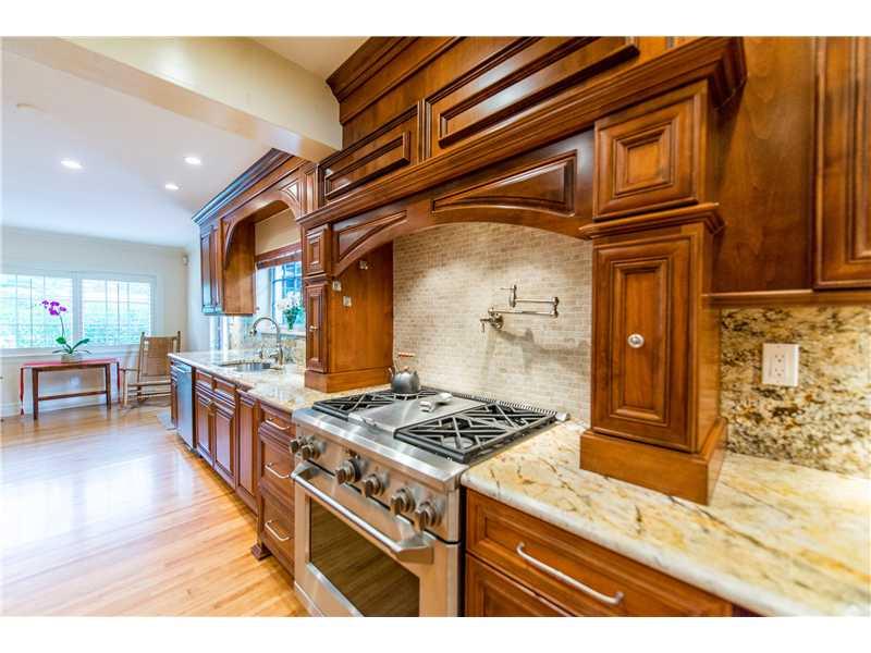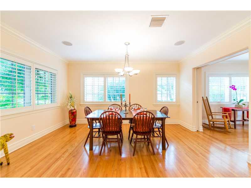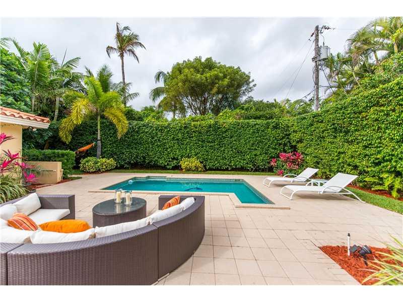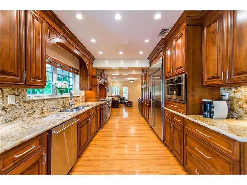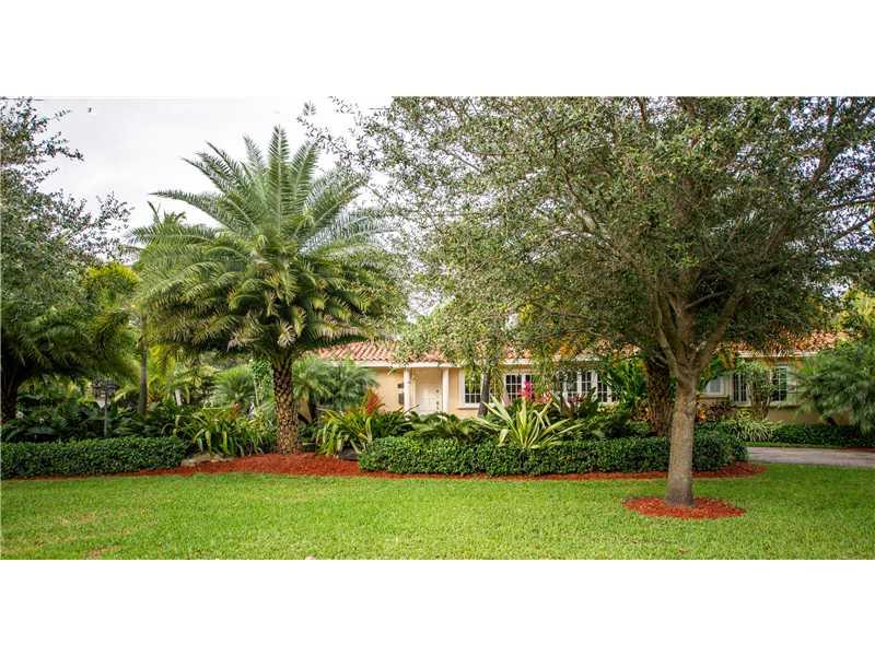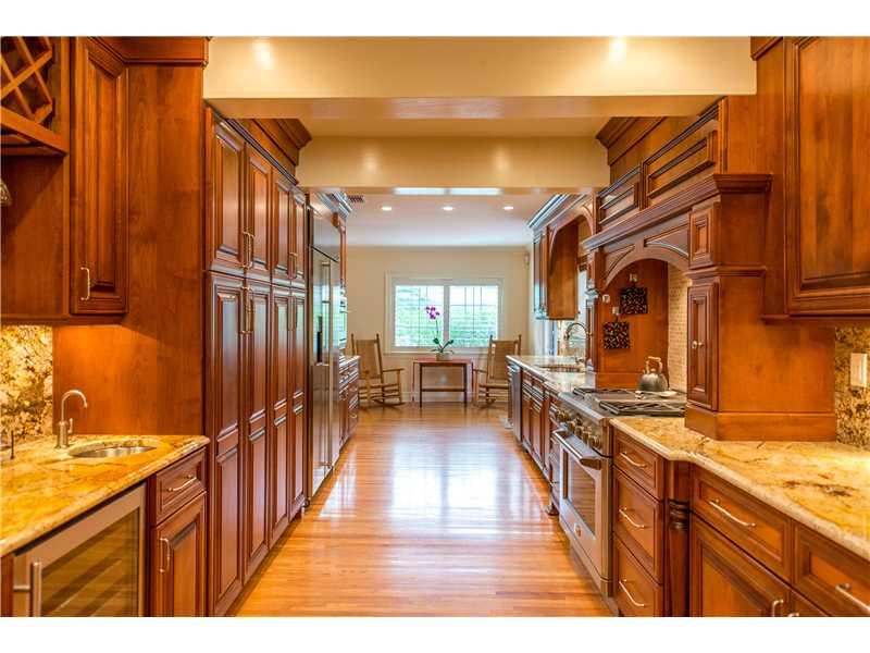 This stunningly and lovingly renovated home is nestled on a secluded 11,880 sf corner lot. With 5BR/3.5 baths this home includes impact glass, FP, gleaming wood floors; a sumptuous eat-in gourmet kitchen has high end stainless steel appliances, gas range and wine cooler. Bathrooms are of jewel box quality. Custom closets, plantation shutters and crown moldings add even more glamour. The glistening pool and patio are ideal for entertaining and barbecues.