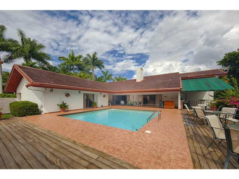 Waterfront 1 story house in Sec 1 on 27,908 sqft lot.Foyer w/marble floors. Living & dining w/wood floors overlooking pool & waterway.Left side of house has office,guest bedroom w/bath & cabana bath.Right side of the house has large updated kitchen w/gran ite,Monogram S/S appliances, island w/attached eat-in-table. 2+ bedrms w/baths & large master suite, bath w/2 sinks,tub & shower.Small patio off master suite.Large covered terrace, built-n-bar & wood deck.Pool, dock,electric davits and accordion shutters.
