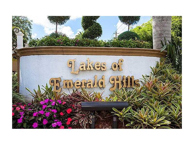 - Amazing corner unit townhouse located in the Lakes of Emerald Hills. Kitchen has been updated featuring wood cabinets and granite countertops. Tile throughout living area and wood floors upstairs. Master suite features completely renovated bath, larg e walk in closet with built-ins, and a private balcony. The two fenced patios and private entrance helps make this unit ideal for living and entertaining. Community features 3 swimming pools, basketball courts and playground.