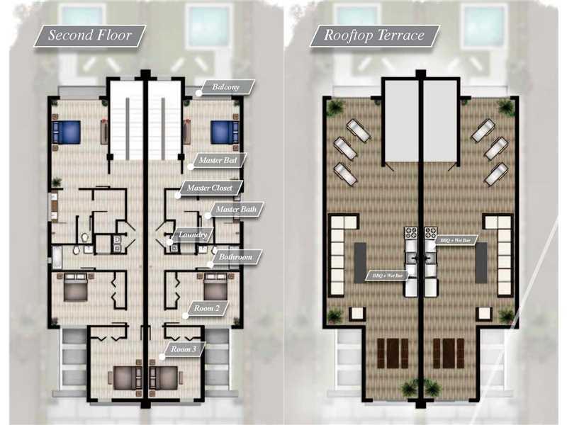 NEW CONSTRUCTION! Luxurious Contemporary Living Coconut Grove Townhouse! High-grade designer finishes and open floor plan. This 3 bedroom, 3 bathrooms, 1 car garage and 2 guest spaces has ultra-modern fixtures and floor-to-ceiling impact glass. Private ro oftop terrace with a high-end barbecue, wet bar, views of lush landscaping and tropical neighborhood. 2,300 SF plus a 950 SF rooftop terrace.