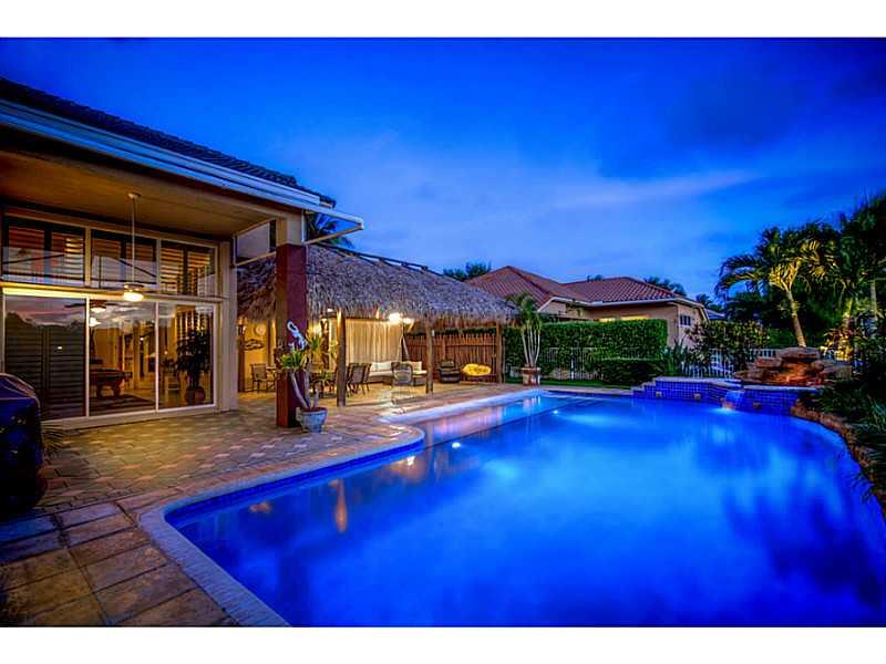 This custom estate golf home offers amenities to please the whole family. From the grand entrance to the exquisite backyard. Floor plan features master on ground level with oversized walk in closet. Open kitchen with granite counters and top of line appl iances. All additional bedrooms are generous in size including guest suite with private balcony overlooking the pool and 9hole golf course.Backyard is the highlight of the home with custom tiki hut and beach style heated pool that are truly one of a kind.