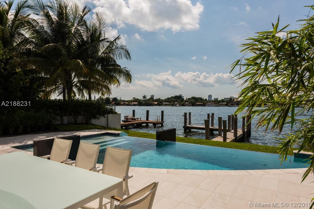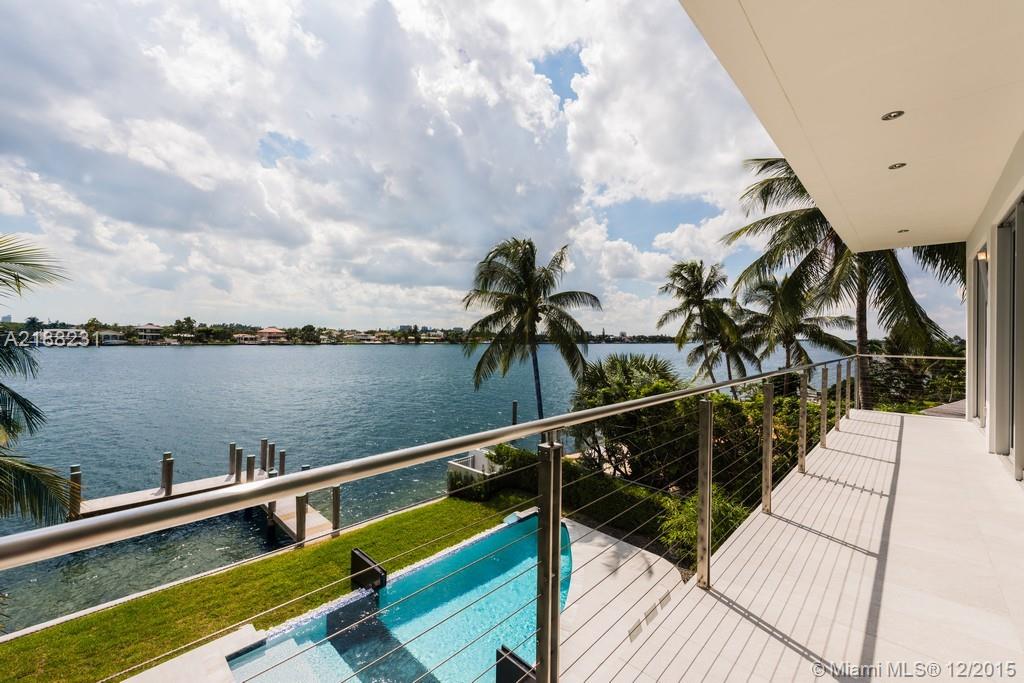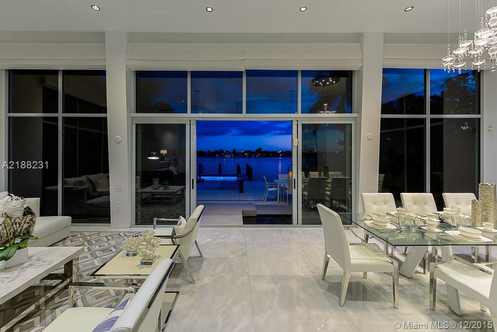 Serene Isle of Biscaya. Contemporary smart waterfront home, offers light filled living spaces surrounded by soaring glass walls & fountains, hovering over the wide bay, creating a sensory filled living environment. State of the art finishes and a great fl oor plan including, 5 bedrooms 5 baths upstairs, with a 1,200 s/f master suite. Dock, pool, 2 car garage plus room for lifts, 2 bedroom suites downstairs, eat in kitchen, family room, office, formal living and dining and more.