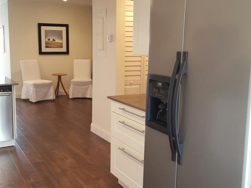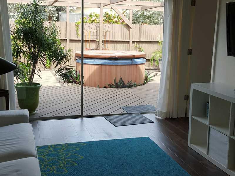 Totally remodeled one story townhome on a beautiful tree lined street. New wood floors throughout, brand new kitchen with white shaker cabinets and all stainless appliances. Split bedroom plan with 2 large bedrooms and an extra room with sliding wooden do ors to close for privacy, could be used as an extra bedroom or office. Large wood decked patio with privacy fence and Jacuzzi. This unit was redesigned with quality in mind and it shows as soon as you drive up. Two assigned and guest parking spaces.