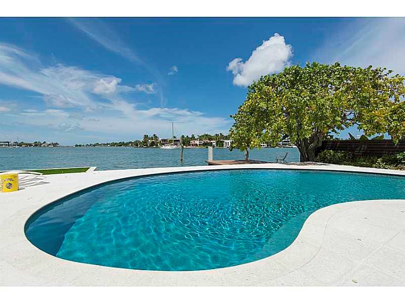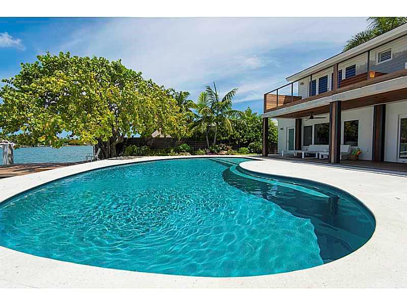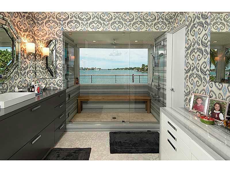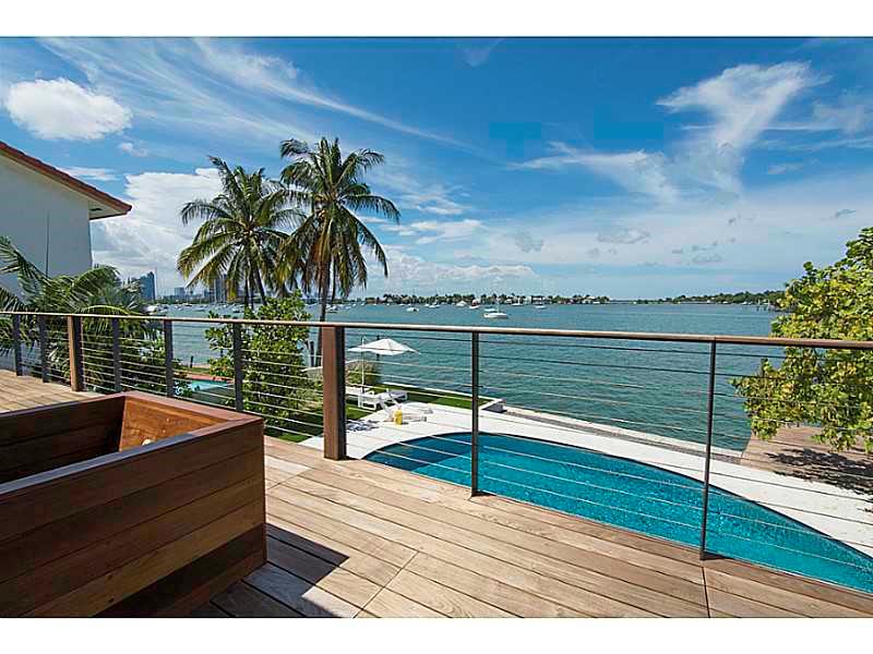 Palm Island Contemporary Waterfront Masterpiece. Fully remodeled in 2014 to modern tropical style, home has a spacious open layout, 4 beds/4.5 baths, soaring ceilings, panoramic impact windows, ocean-view master bath, and ocean-view 2nd story deck with ho t tub connected to bedrooms. Perfect for entertaining with free-form zero-entry pool, covered BBQ area, open white marble kitchen with stainless steel chef's kitchen; custom floors, décor, and lighting throughout; endless Biscayne Bay and city views.