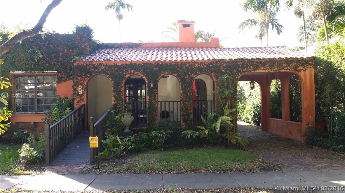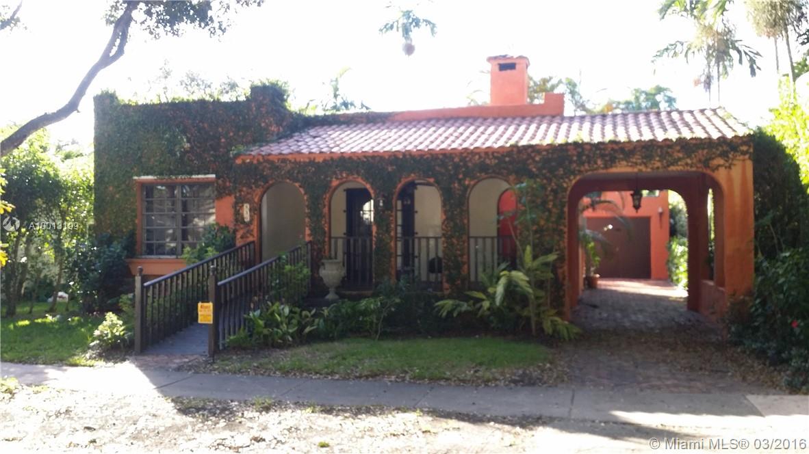 Adorable & Charming Old Spanish Home in North Gables. 2 /1 on 5,000 sq. ft lot. Built in 1924 & lovingly restored. The house features a beautiful covered entry porch with arched openings. Carport w/ pavers. Inside, living room with original wood burning fireplace, formal Dining Room, remodeled kitchen, stainless steel appliances, wood floors throughout & French doors leading to wood deck. House is handicap accessible w/ ramps on front & back. Bathroom w/ shower. Detached garage can be Bonus room.