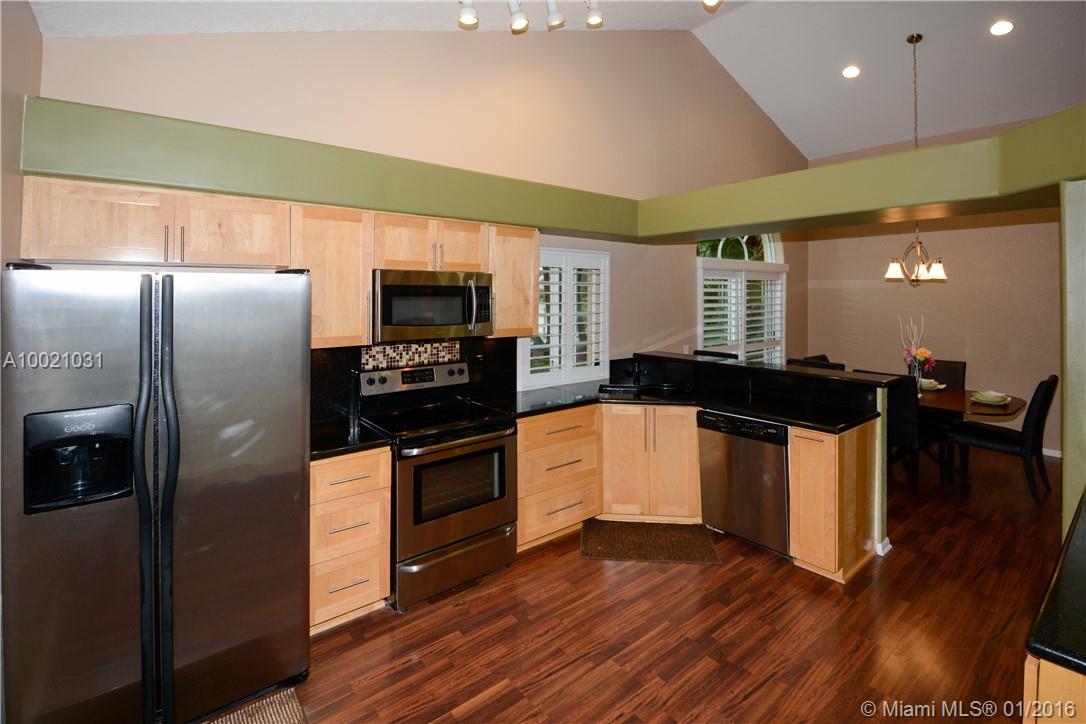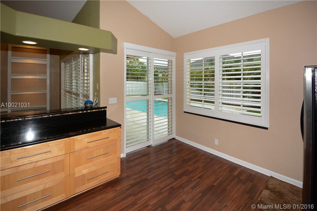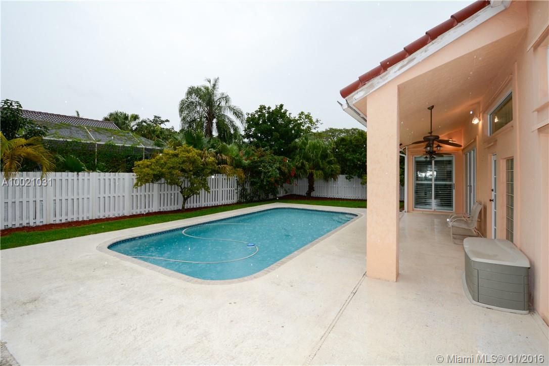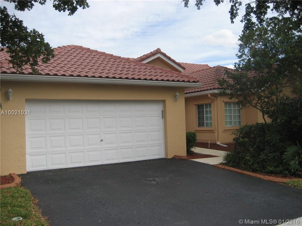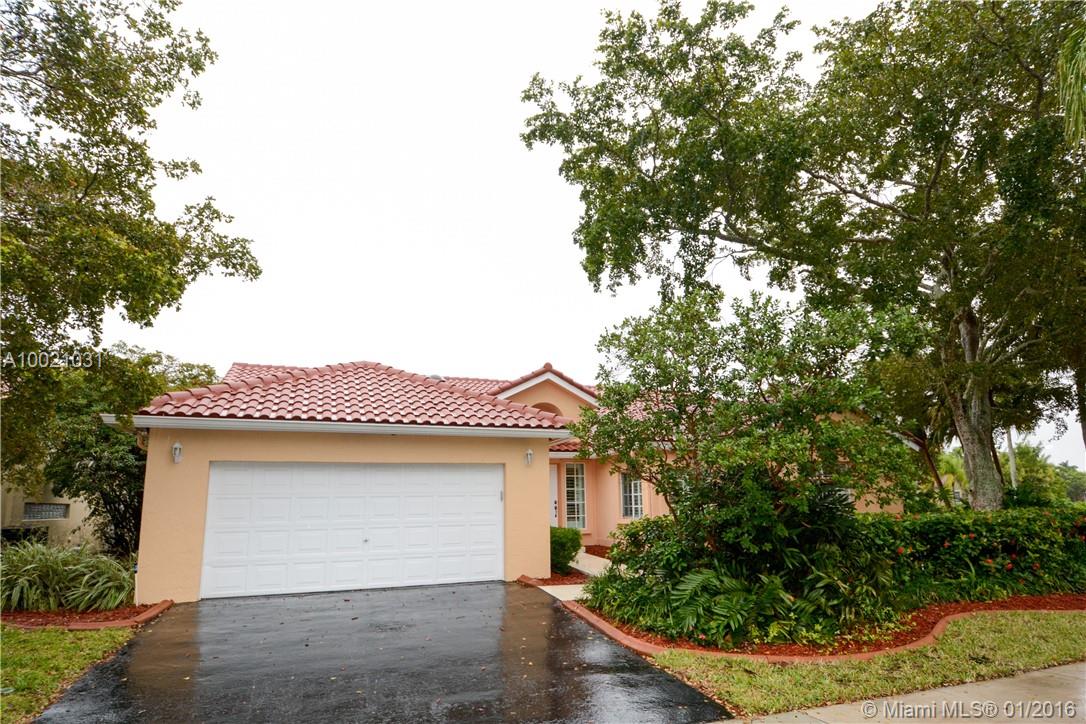 Move-in condition Aledo model is on a nice sized corner lot and offers 3BR/2BA & 2 car garage. Upgraded eat-in kitchen with wood cabinets, granite counters and stainless steel appliances. Fully fenced and private yard and swimming pool and covered patio. Elegant plantation shutters on all windows. Wood laminate flooring in the social areas and carpeting in the bedrooms. Gated community is in walking distance to Weston Town Center.