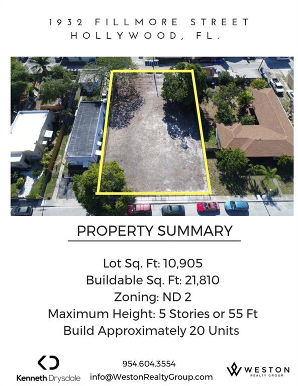 CLEARED VACANT LOT READY TO BUILD ON! Located just 3 blocks from Young Circle, 1932 Fillmore offers a unique opportunity with a 10,905 sqft CLEARED lot space and the newly appointed ND-2 flexible zoning. Current zoning allows for the development of office/retail space and residential units with a Density-2 square footage of approximately 22,000 total sq ft. A maximum height of 5 stories or 55 feet and approximately 20 residential units. Surrounding areas offer many attractions to the already in demand downtown Hollywood area with easy access to all major highways and the beach!