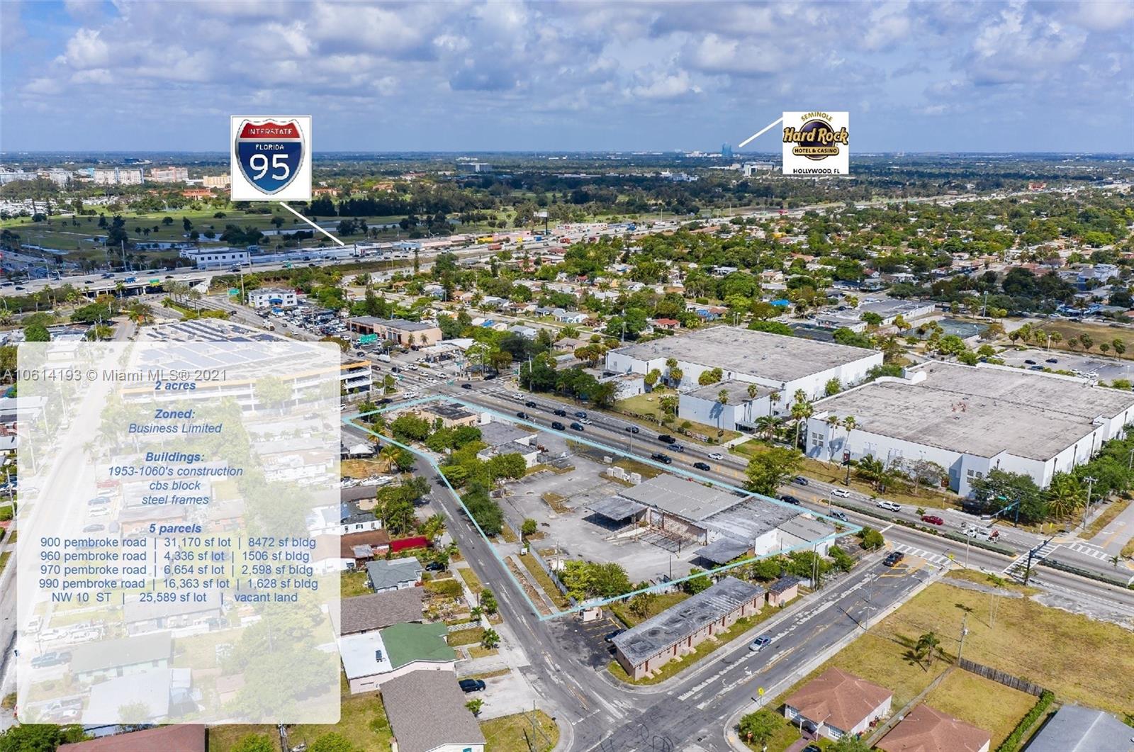 GREAT OPPORTUNITY! Redeveloper fit. There are approx 2 acres total. A few buildings exist, 1960's construction. Not a NNN resale. Vacant property. While Seller MAY be willing to close open permit(s), there has been no historical effort made toward clearing any code violation(s). The property is NOT compliant with 40-year recertification. Fantastic exposure being closer to I95 and fronting main road. Pembroke Road, just East of I95. 5 minutes to Ocean Dr. One of the corner lots fronts an intersection. Environmental survey was conducted with no evidence of any environmental issues. These findings were reconfirmed by Broward County inspection as well. We have all the documentation.Parcel folio's are 51422128-0110, -0140, -0030, -0081, -0090. Total Bldgs Square Feet Approx 14,000