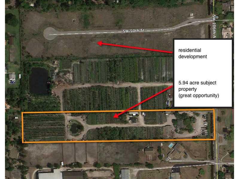 EXCELLENT OPPORTUNITY IN DAVIE, FL TO PURCHASE FOR FUTURE RESIDENTIAL OR INVESTMENT. LISTED BELOW BCPA VALUE OF $933K. 5.94 ACRE PROPERTY CURRENTLY OPERATES AS NURSERY WITH MONTH -TO-MONTH TENANT. OF THE 5.94 ACRE PROPERTY, 4.32 ENJOYS THE AG DESIGNATION. A POND ON PROPERTY ALLOWS FOR NECESSARY WATERING OF ALL TREES & PLANTSWITHOUT INCURRING WATER BILL. THERE IS A HOME ON PROPERTY (UTILIZED AS AN OFFICE) AND A UTILITY WORKSHOP FOR MACHINERY & VEHICLES. CENTRALLY LOCATED BEWTEEN GRIFFIN & STIRLING.
