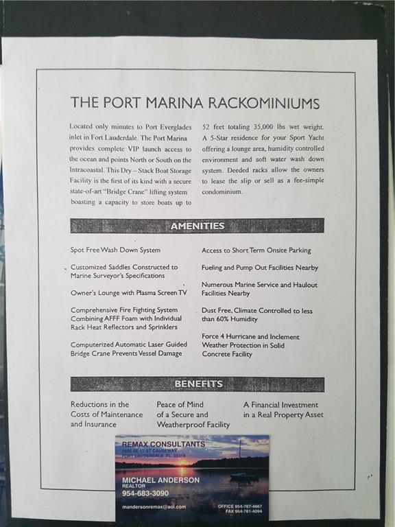 SALE - SLIP SIZE 42'L X 15'W X 17'H. LUXURY DEEDED YACHT STORAGE IN WORLD'S FIRST COMPUTERIZED DRY-STACK MARINA FACILITY FOR BOATS UP TO 52'LOA AND 35,000 LBS, STATE-OF-THE-ART BRIDGECRANE LIFT SYSTEM, FRESHWATER WASHDOWN, CLIMATE-CONTROLLED HURRICANE RAT ED BUILDING. A BOATER'S DREAM WITH OWNER'S LOUNGE, RESTROOMS AND SHOWERS, ONLY MINUTES TO THE OCEAN