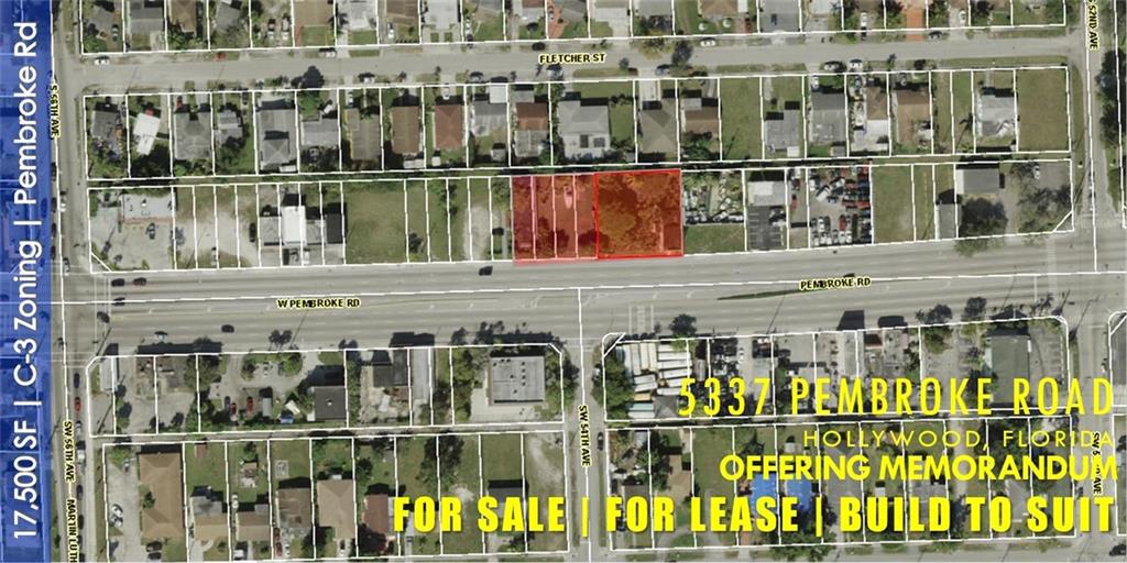 J U S T R E – P R I C E D 7 contiguous lots (17,500 ft.²) price at an unbelievable $27 per SF with C3 zoning. Owner may consider holding a purchase money 2nd mortgage. The property’s prime location near I-95, 411 and the Turnpike make it accessible to all areas of South Florida. The properties also close to the Fort Lauderdale Hollywood International Airport and Port Everglades and is minutes to the Dade County. Zoning will allow for the following usage: commercial, retail, mixed-use, hotel/motel, office, pain management clinic, place of worship, gas station and daycare (special exception required for the last 2). This exceptional location provides 175 feet of direct exposure on a major artery, Pembroke Road.