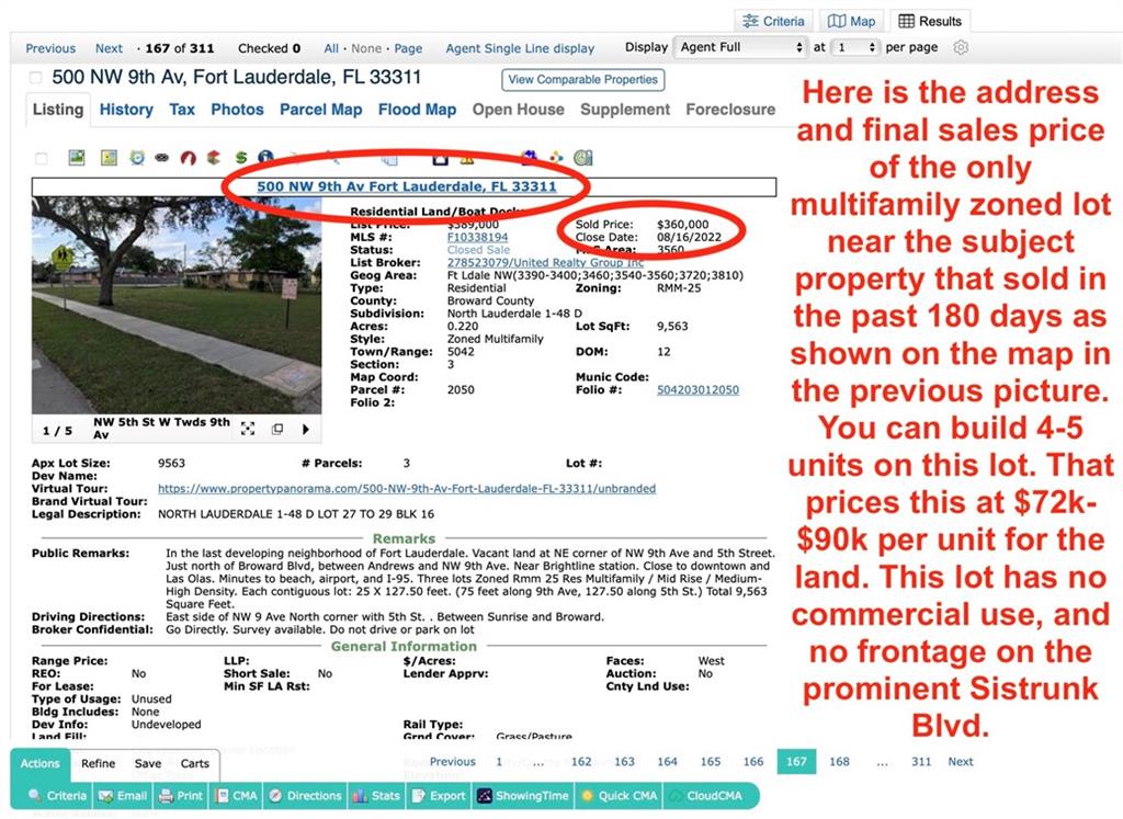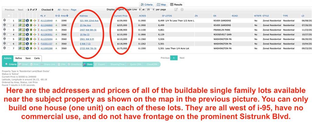 Rare opportunity on rapidly developing Sistrunk Blvd. Drive Sistrunk: see surge of construction. Opportunity zone. Huge tax benefits. Potential to receive hundreds of thousands from CRA. Included plans for 6 unit building: 5 2 bed residential units 1 ground level commercial unit. Seller had preliminary meeting with city: plans are in accordance with zoning. Permits have not been pulled. Use these plans, customize them, or design your own. Active comps in area:$108.9k-$225k per unit for land. Recently sold comps in area:$72k-$120k per unit for land. See pics. Subject property under $50k per unit; approx 50% OFF market value. New 2 bed apts on Sistrunk rent:$2.3-$2.8k. Commercial space:$25-30/sqft per year. Potential 10%-25% cap rate depending on building cost and CRA $. Seller will finance.