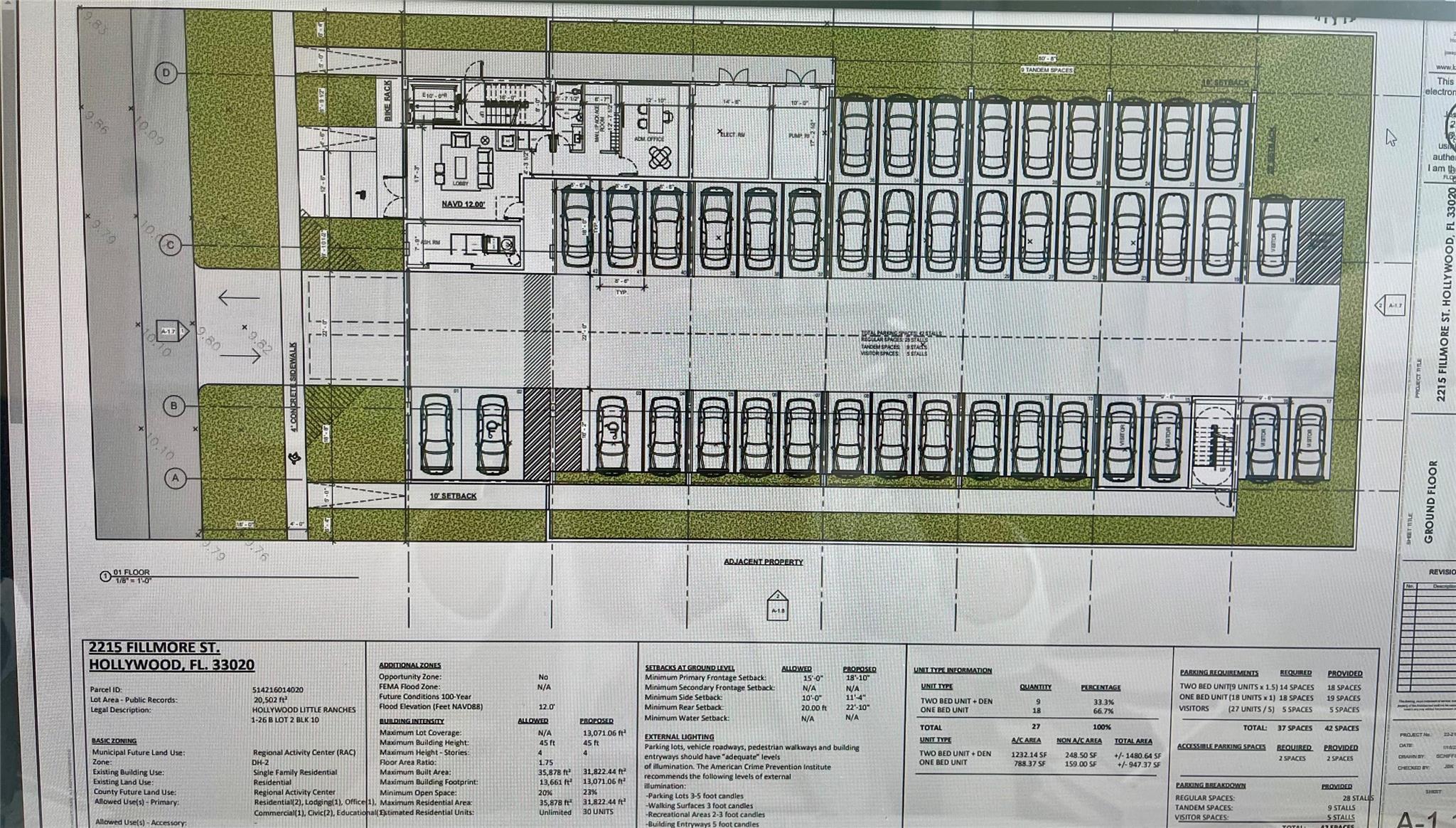 SO THIS PROJECT IS FULLY APPROVED MARCH 12,2024 FROM THE CITY OF HOLLYWOOD!"READY TO START BUILDING PERMITS! 2 OTHER PROJECTS WILL START ON STREET "Fillmore Breeze" is a developer & investor opportunity, strategically designed by the renowned Hollywood Architect Joseph Kaller. The project consists of 27 units, 9 units: 2 bedrooms + den & 2 bathrooms Size: 1232 sq. ft. under a/c & 1460 total sq. ft. 18 units: 1 bedroom & 1 bathroom Size: 788 sq. ft. under a/c & 947 total sq. ft. units come with washer dryers. Amenities: The building features a rooftop community center and outdoor space, providing additional attractive features for potential buyers or tenants. Property has month-to-month tenants, gross annual income of $51,000.00. Potential revenue stream while the project is being developed