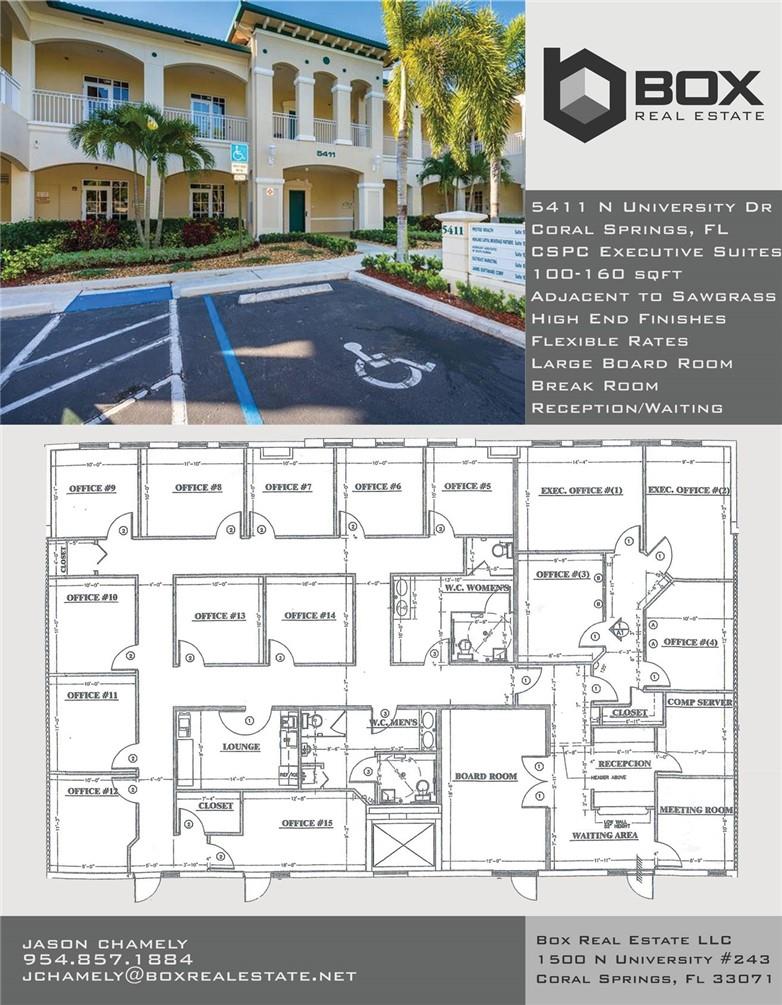 100 sqft - 170 sqft private executive suites available in the Coral Springs Professional Campus. High end Finishes throughout. Well appointed reception, waiting, and board room. Utilities and Internet Included Furnished units available. The Coral Springs Professional Campus is the Premier Office Campus in Coral Springs. Located off of the Sawgrass Expressway on University Drive and Westview it has easy access to Parkland, Boca, Deerfield and surrounding areas.