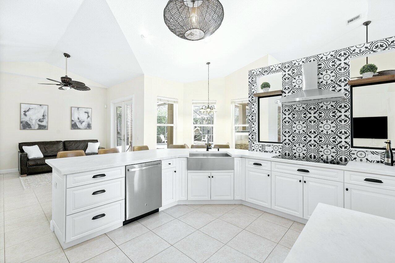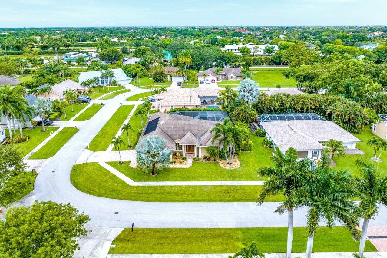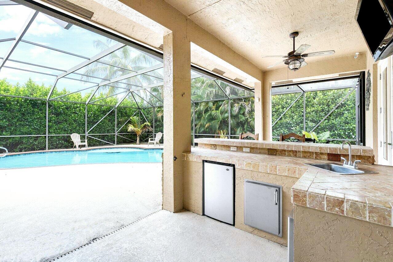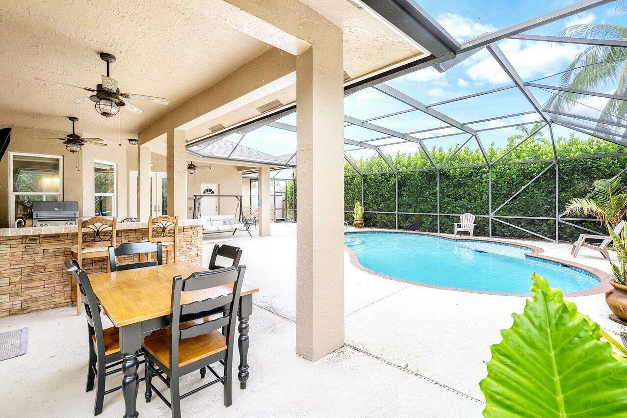 Incredible picturesque Corner lot just steps away to amazing park that leads to WEF path! Absolutely unparalleled in shortcut distance, this gorgeous property awaits you! With a floor plan that was masterfully designed for entertaining, the newly renovated kitchen, family room has gorgeous Bohemian tiles, glass with high end Carrara marble finishes to host guests & family! The massive counter bar space and eat in kitchen are so inviting and beautiful! So much pool fun with a solar heated, screened, enclosed pool and full, outdoor stone-accent kitchen to grill by Sunset views! Have awesome dinner parties and then get the golf cart and scooters ready for WEF, the path is unrivaled! Property has no HOA, Impact windows/sliders. Lg master suite w/access to Pool. $6.8k offseas, $12.2 seasonal