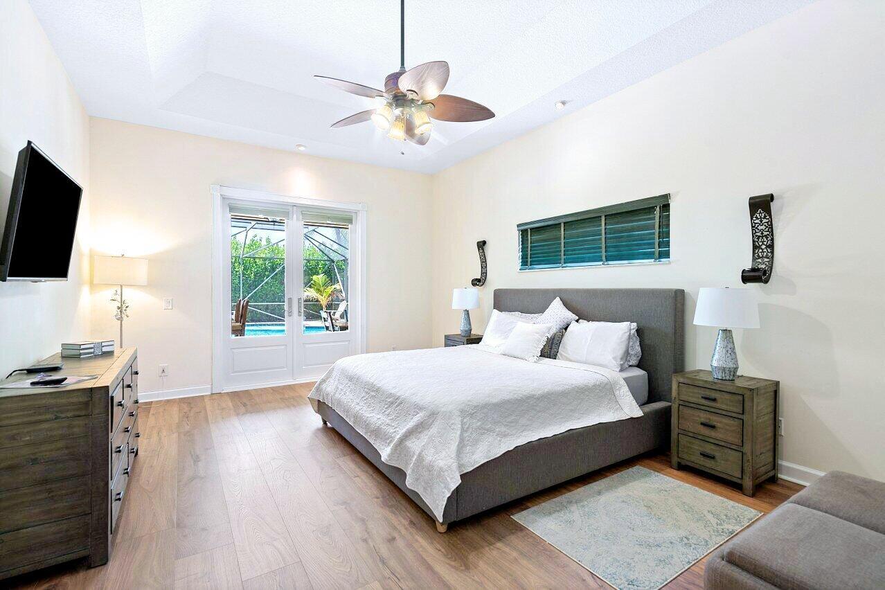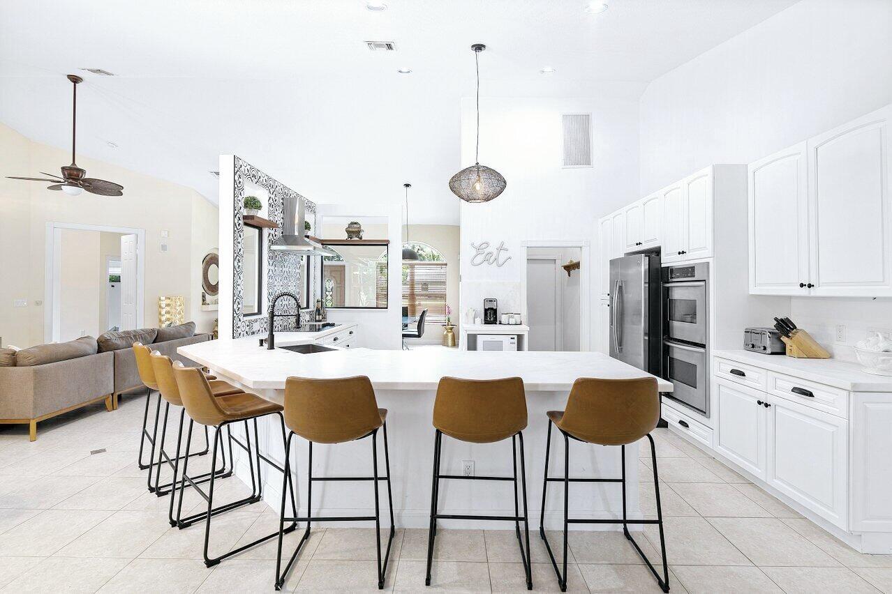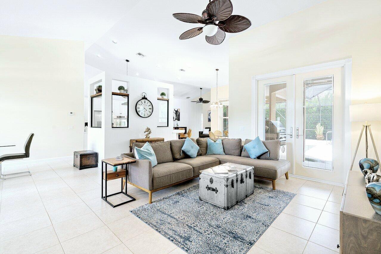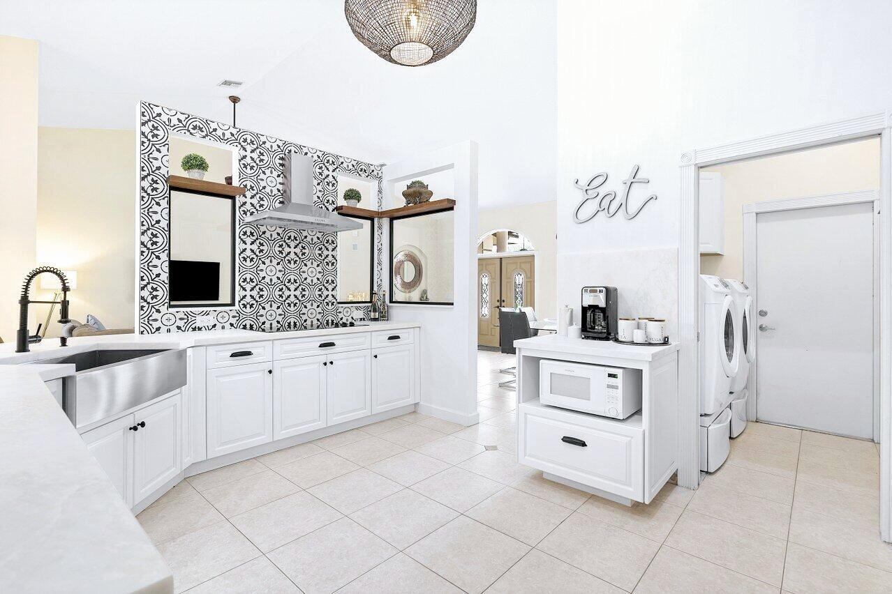 Incredible picturesque Corner lot just steps away to amazing park that leads to WEF path! Absolutely unparalleled in shortcut distance, this gorgeous property awaits you! With a floor plan that was masterfully designed for entertaining, the newly renovated kitchen, family room has gorgeous Bohemian tiles, glass with high end Carrara marble finishes to host guests & family! The massive counter bar space and eat in kitchen are so inviting and beautiful! So much pool fun with a solar heated, screened, enclosed pool and full, outdoor stone-accent kitchen to grill by Sunset views! Have awesome dinner parties and then get the golf cart and scooters ready for WEF, the path is unrivaled! Property has no HOA, Impact windows/sliders. Lg master suite w/access to Pool. $6.8k offseas, $12.2 seasonal