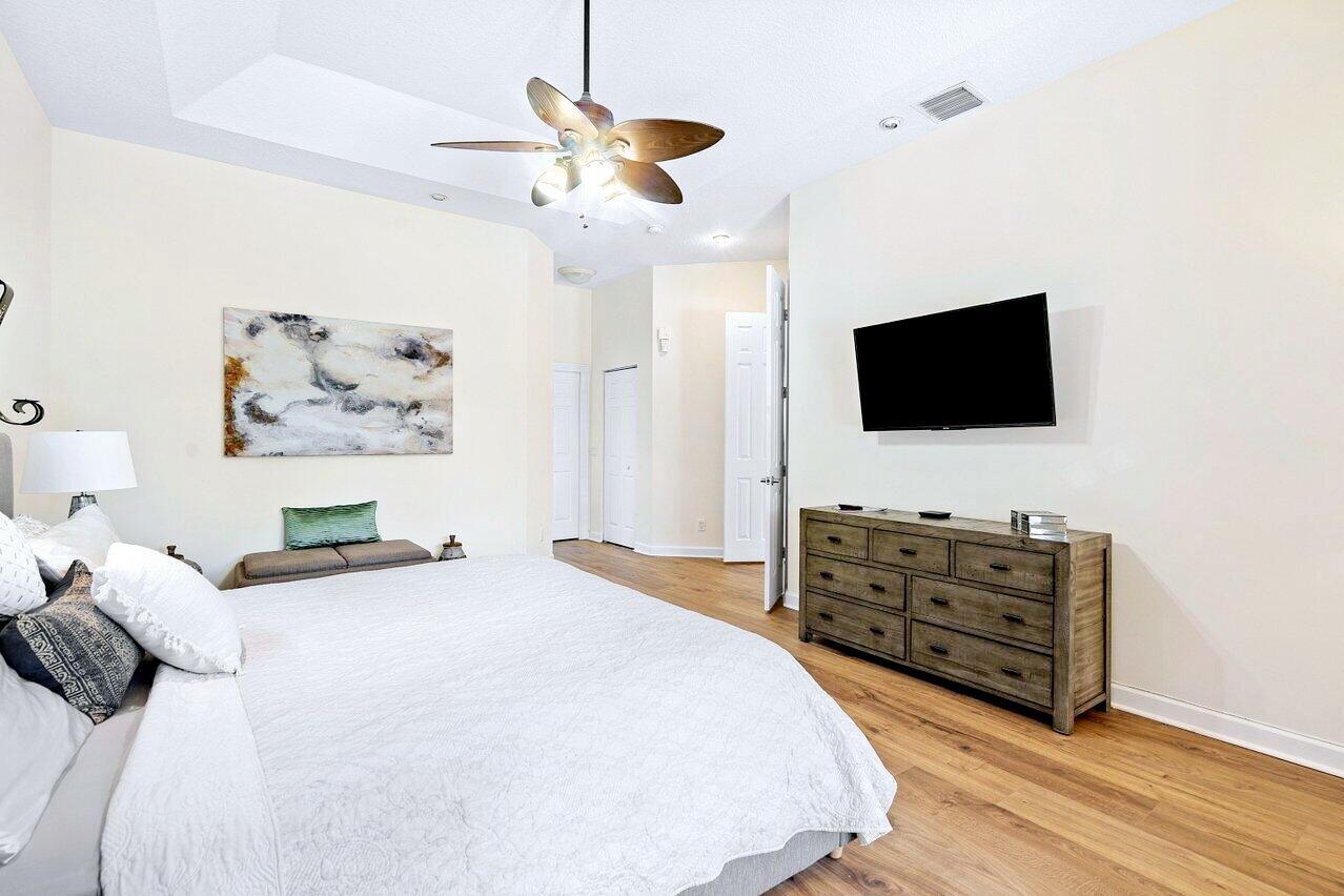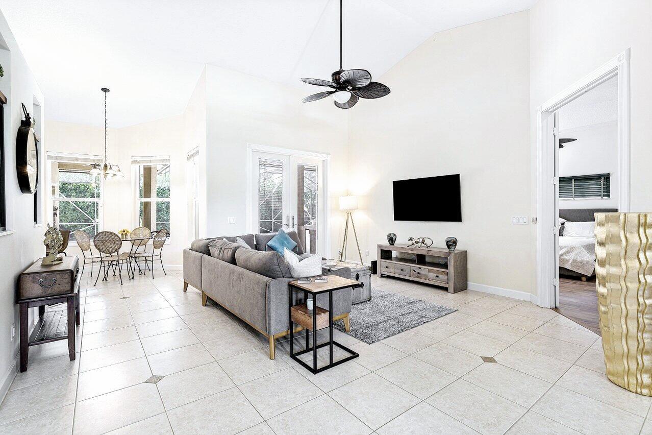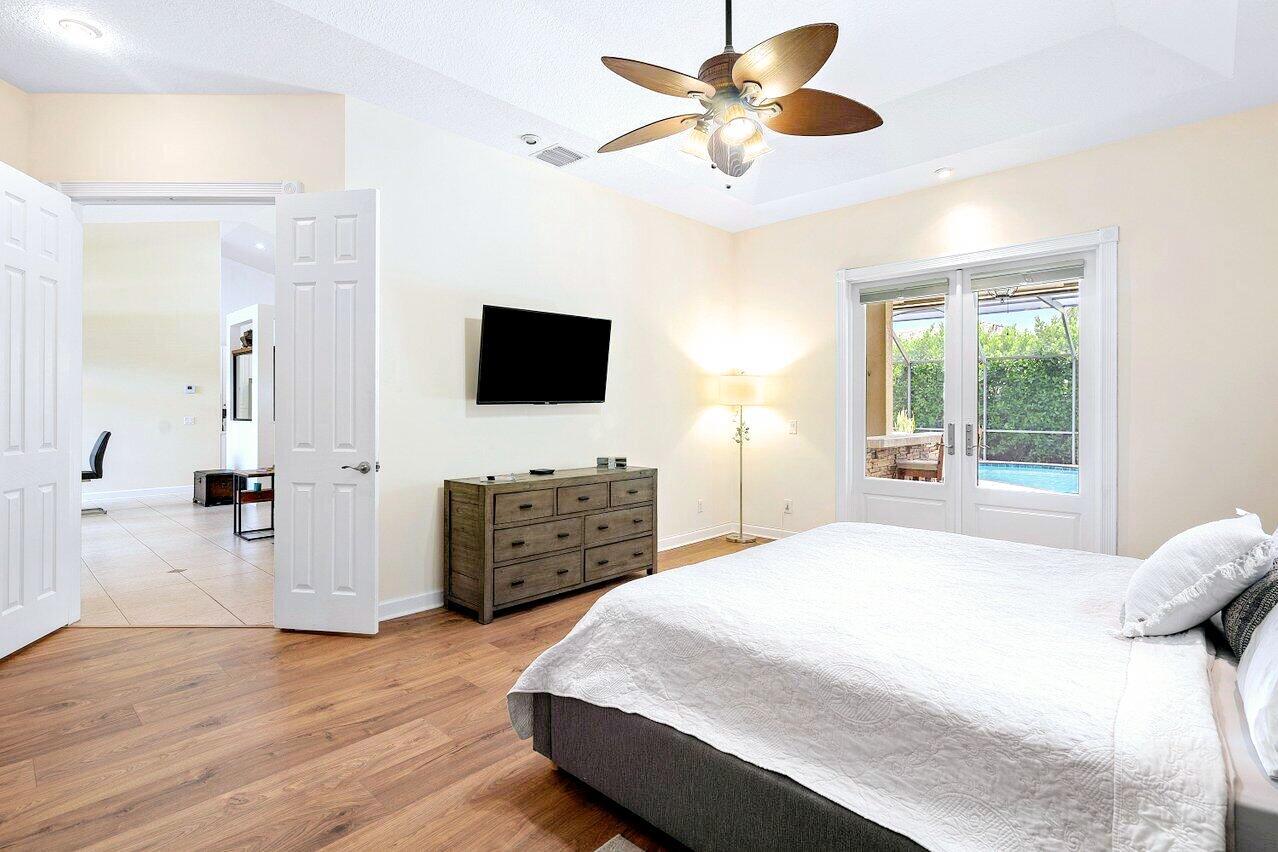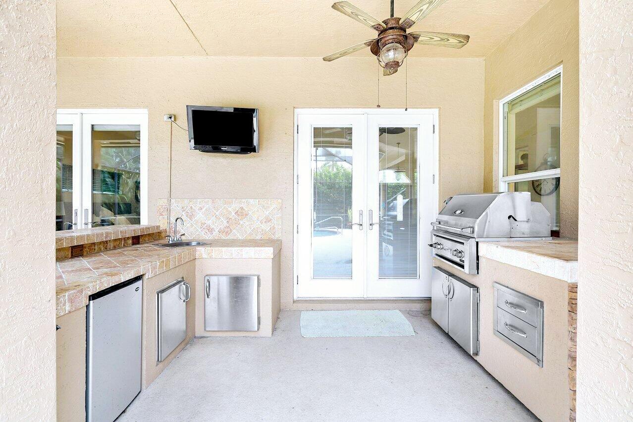 Incredible picturesque Corner lot just steps away to amazing park that leads to WEF path! Absolutely unparalleled in shortcut distance, this gorgeous property awaits you! With a floor plan that was masterfully designed for entertaining, the newly renovated kitchen, family room has gorgeous Bohemian tiles, glass with high end Carrara marble finishes to host guests & family! The massive counter bar space and eat in kitchen are so inviting and beautiful! So much pool fun with a solar heated, screened, enclosed pool and full, outdoor stone-accent kitchen to grill by Sunset views! Have awesome dinner parties and then get the golf cart and scooters ready for WEF, the path is unrivaled! Property has no HOA, Impact windows/sliders. Lg master suite w/access to Pool. $6.8k offseas, $12.2 seasonal
