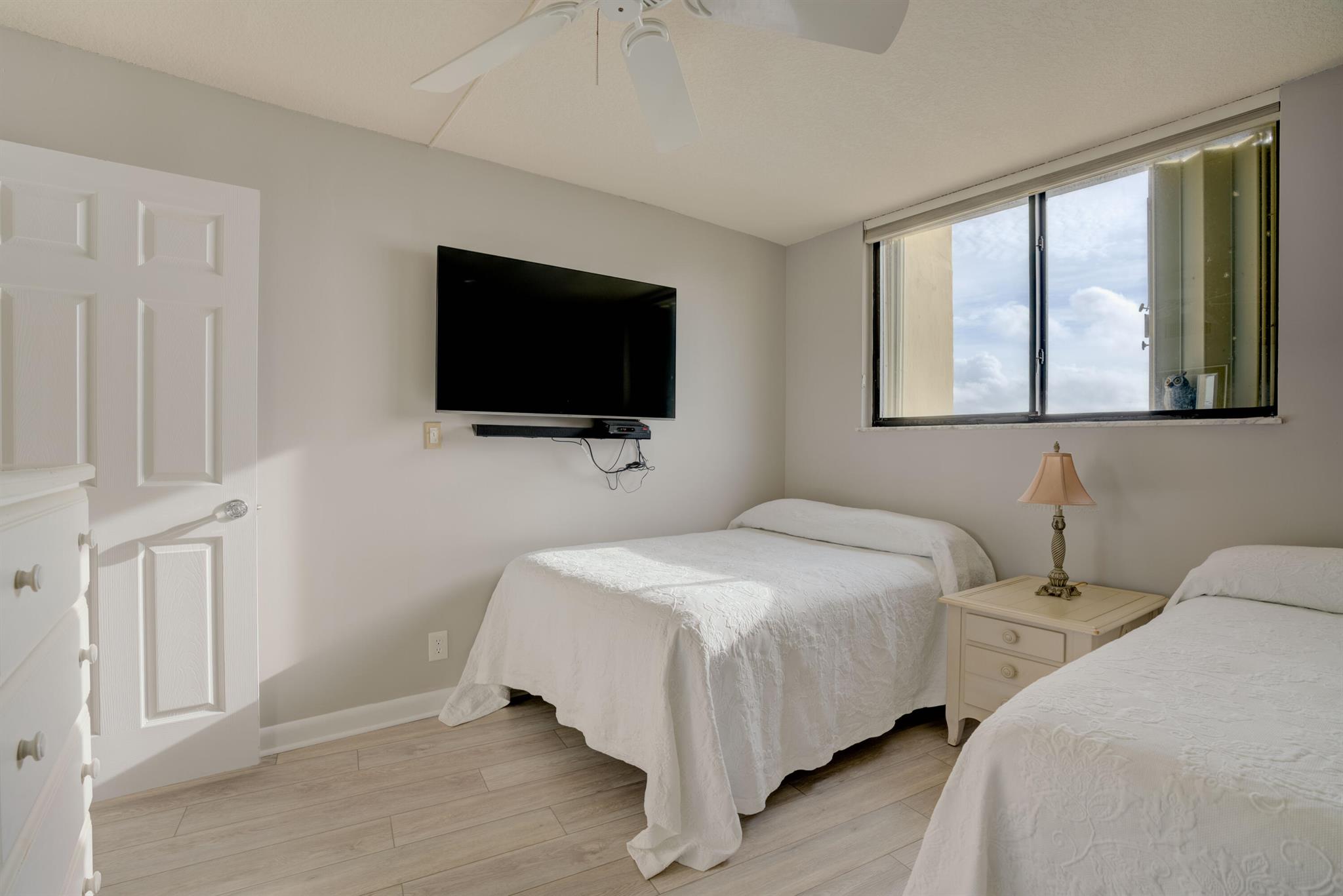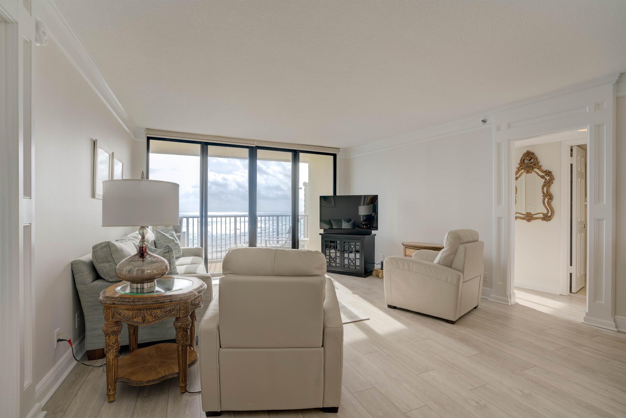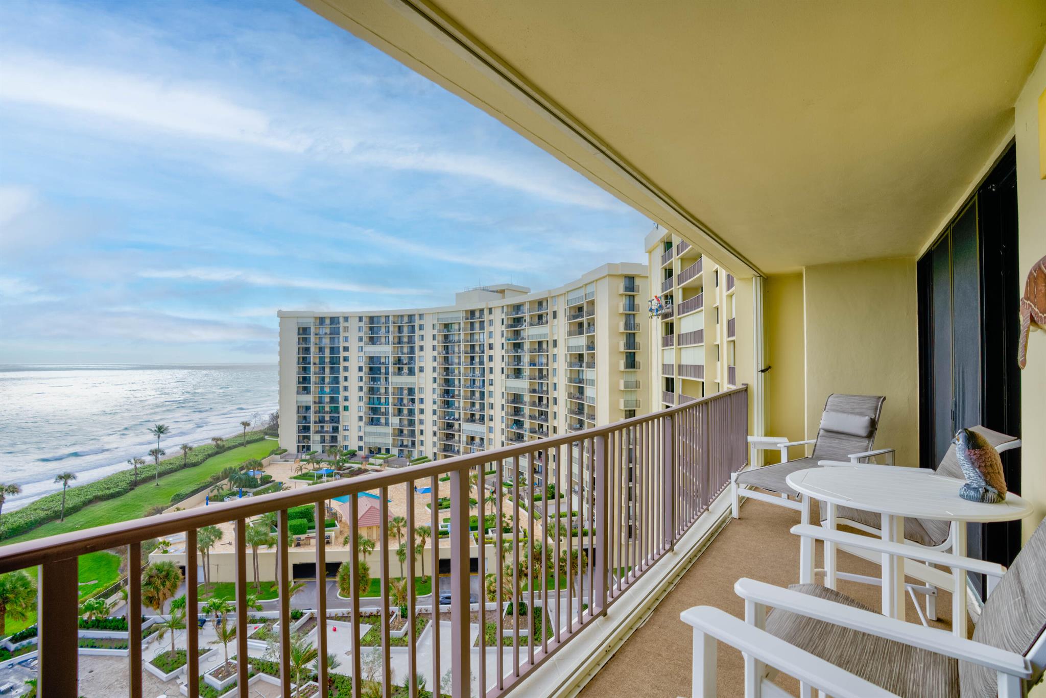 Enjoy stunning blue water ocean views from this 9th floor condo in Ocean Trail Towers, a gated resort style community, located in the heart of all the best Jupiter has to offer! Ocean Trail boasts 22 acres of beachfront property including tennis courts, pools, gym and hot tubs. The balcony and every room in this 2 bedroom, 2 bath condo offer spectacular views of the ocean. This unit is fully furnished and ready to move-in featuring a split floorplan and upgrades throughout including new flooring. Walk down within minutes and enjoy the beautiful ocean or take your sandy feet right next door to the Jupiter Beach Resort's beach bar for sunset happy hours. Nestled in Jupiter Beach Rd, you are a ''Zeke's'' Golf Cart Taxi away from all dining, entertainment and shopping experiences.
