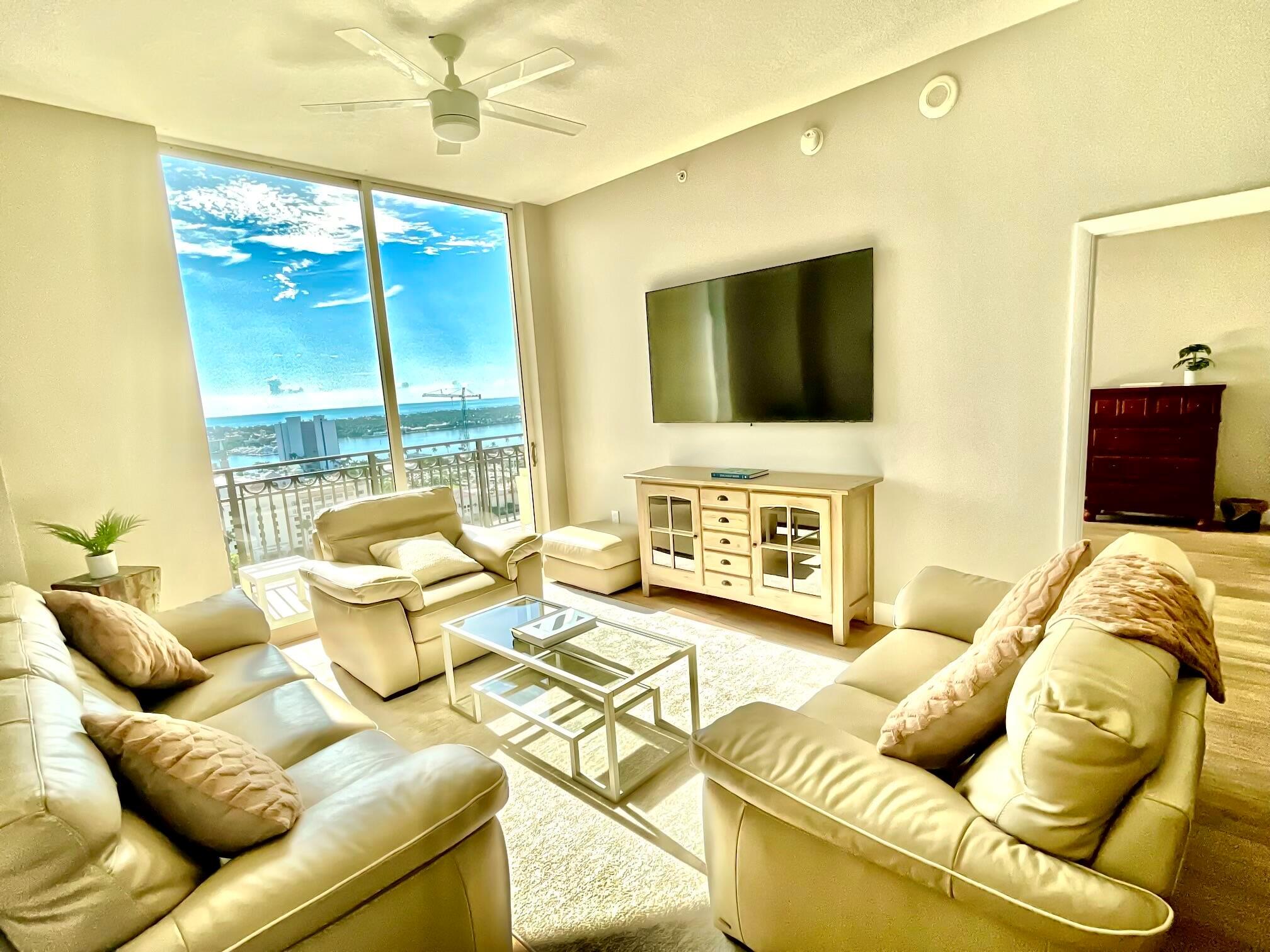 Wake up to ocean views in this spectacular fully-furnished penthouse. Located in the heart of downtown West Palm Beach, this unit is minutes from the beach, restaurants, bars, shopping, and everything that South Florida living has to offer. In addition to a balcony facing the ocean, it features a fully equipped open kitchen with stainless appliances and wine cooler, master bath with dual sinks, separate shower, jacuzzi tub,10 ft ceilings, two walk in closets, and W\D in unit. The luxury amenities available at CityPlace South Tower include valet parking, an infinity lap size pool, spa, steam room, hot tub, sauna, fitness center, massage room, club lounge, and summer kitchen. Lease dates are flexible. Avail May 1, 2025.