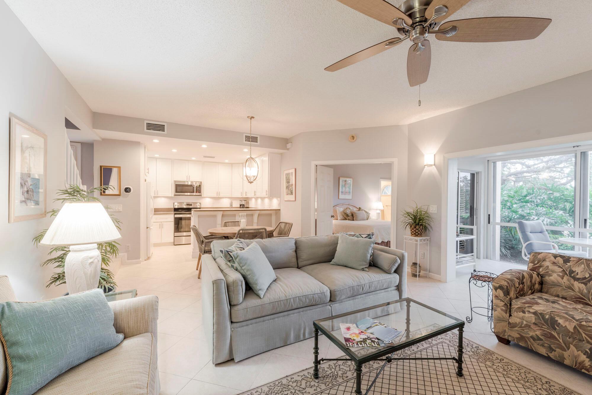 Available Off-Season($4000/month) Steps from turquoise Jupiter Beach lies this stunning 2-level condo! Golf & lake views grace your southern lanai, where ocean breezes & sunset hues mingle. Inside, a sleek kitchen boasts Corian, white Shaker cabinets, & stainless steel. Tile flows underfoot, extending seamlessly to the expanded lanai for ultimate indoor-outdoor living. Completely renovated second floor bedroom, bathroom and staircase. Upstairs, find 1 tranquil bedroom & a spa-like master bath. 1-car garage, W/D, & pool access complete this Inlet District dream! Walk to beach, shops, & restaurants.