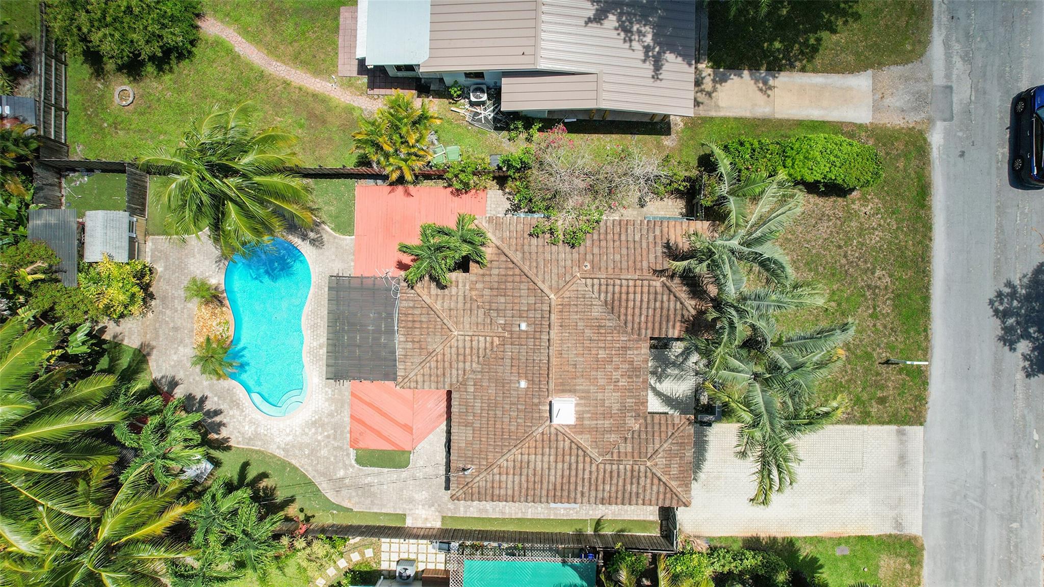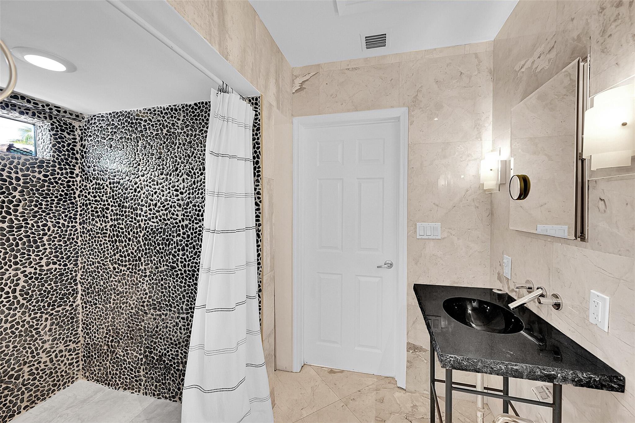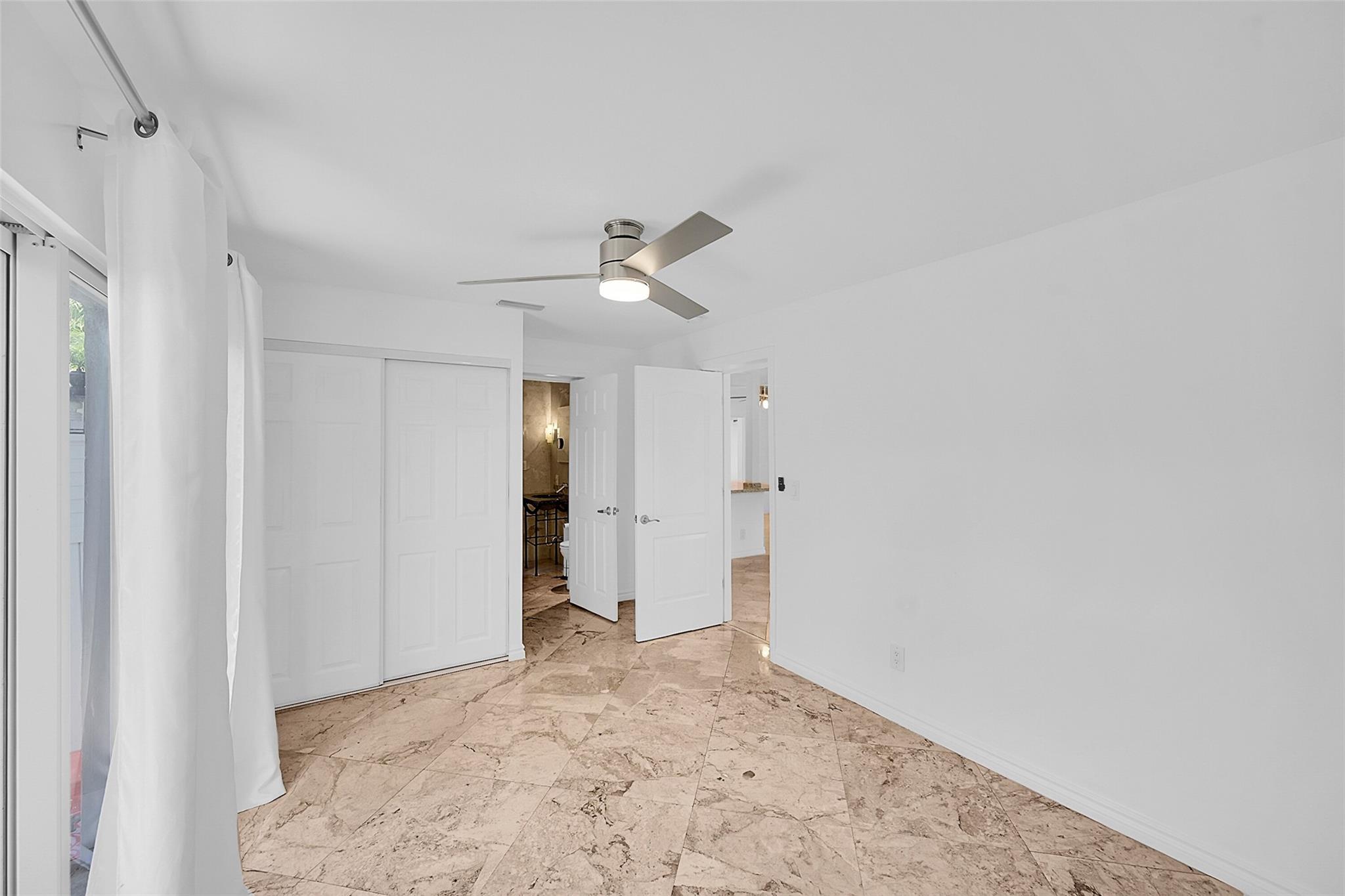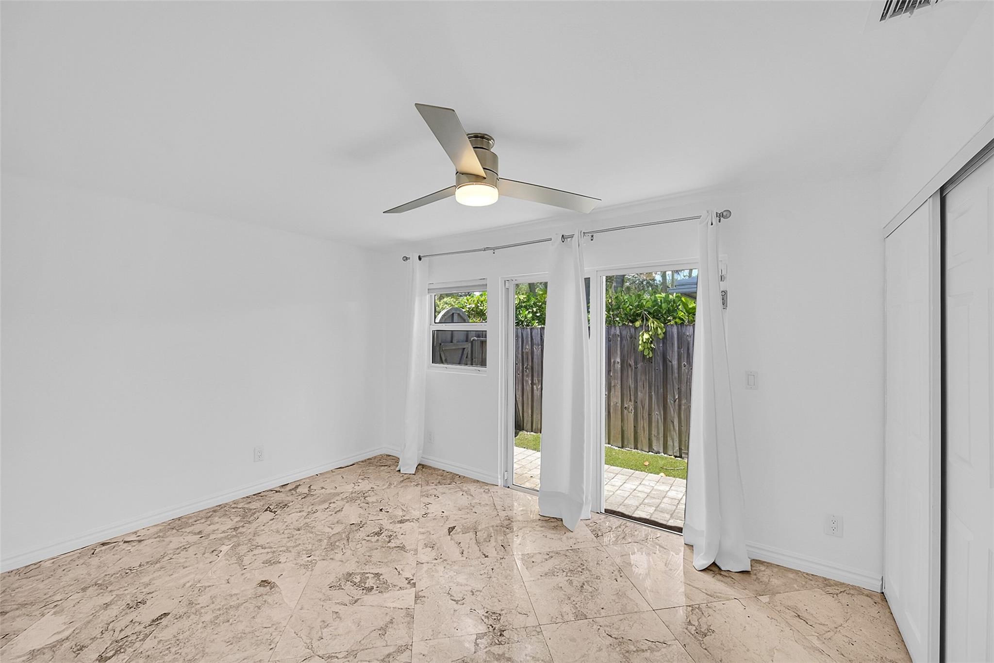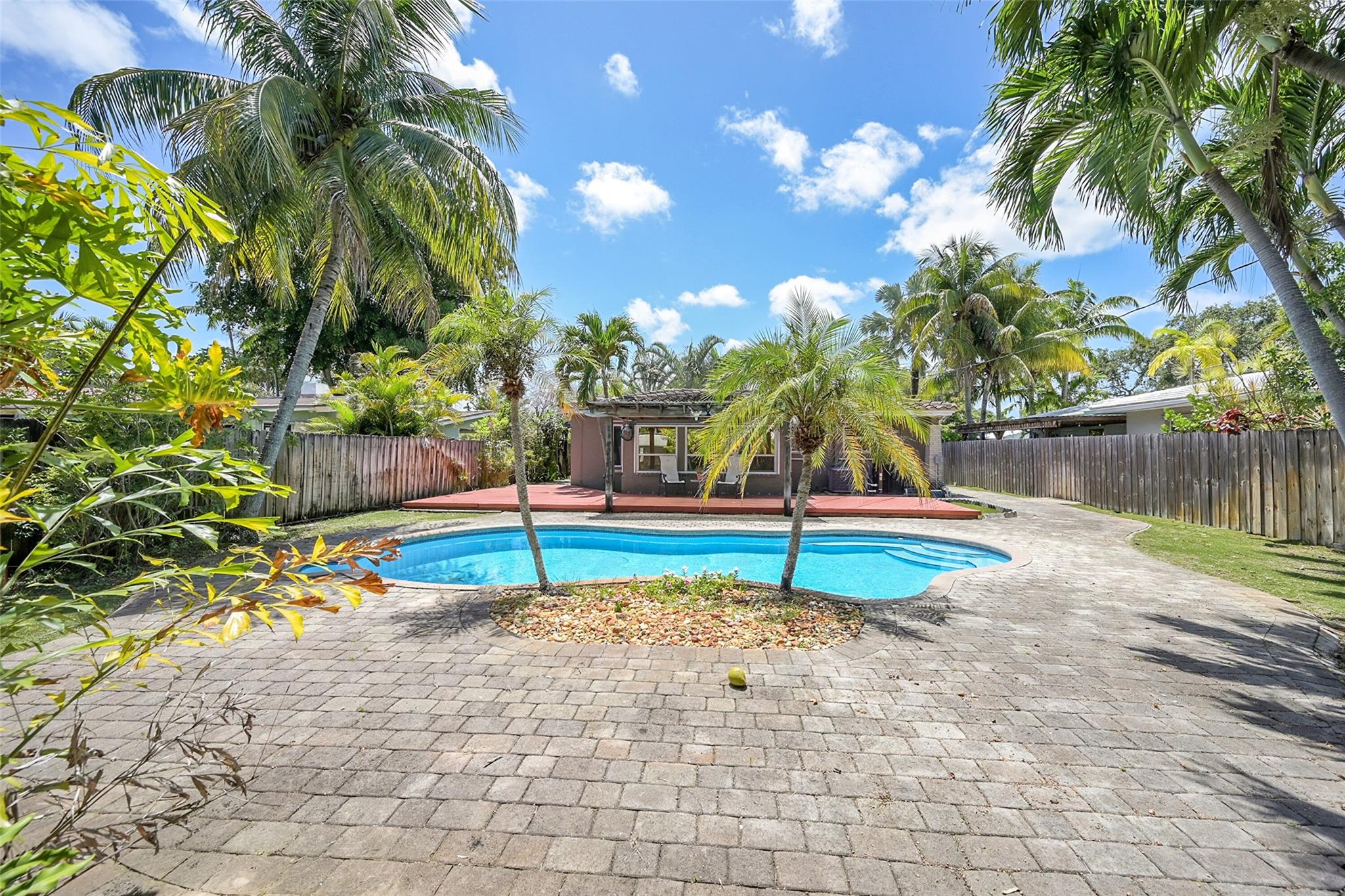 This beautiful home is located in Poinsettia Heights area of Ft Lauderdale. Enjoy the views of the large tropical backyard pool area. This three bedroom, two bath home has marble floors, renovated kitchen and baths with step- in showers. Bedrooms all have access doors to the yard. Yard has wood covered deck for out door living. The garage has been converted into third bedroom. Pool is heated.