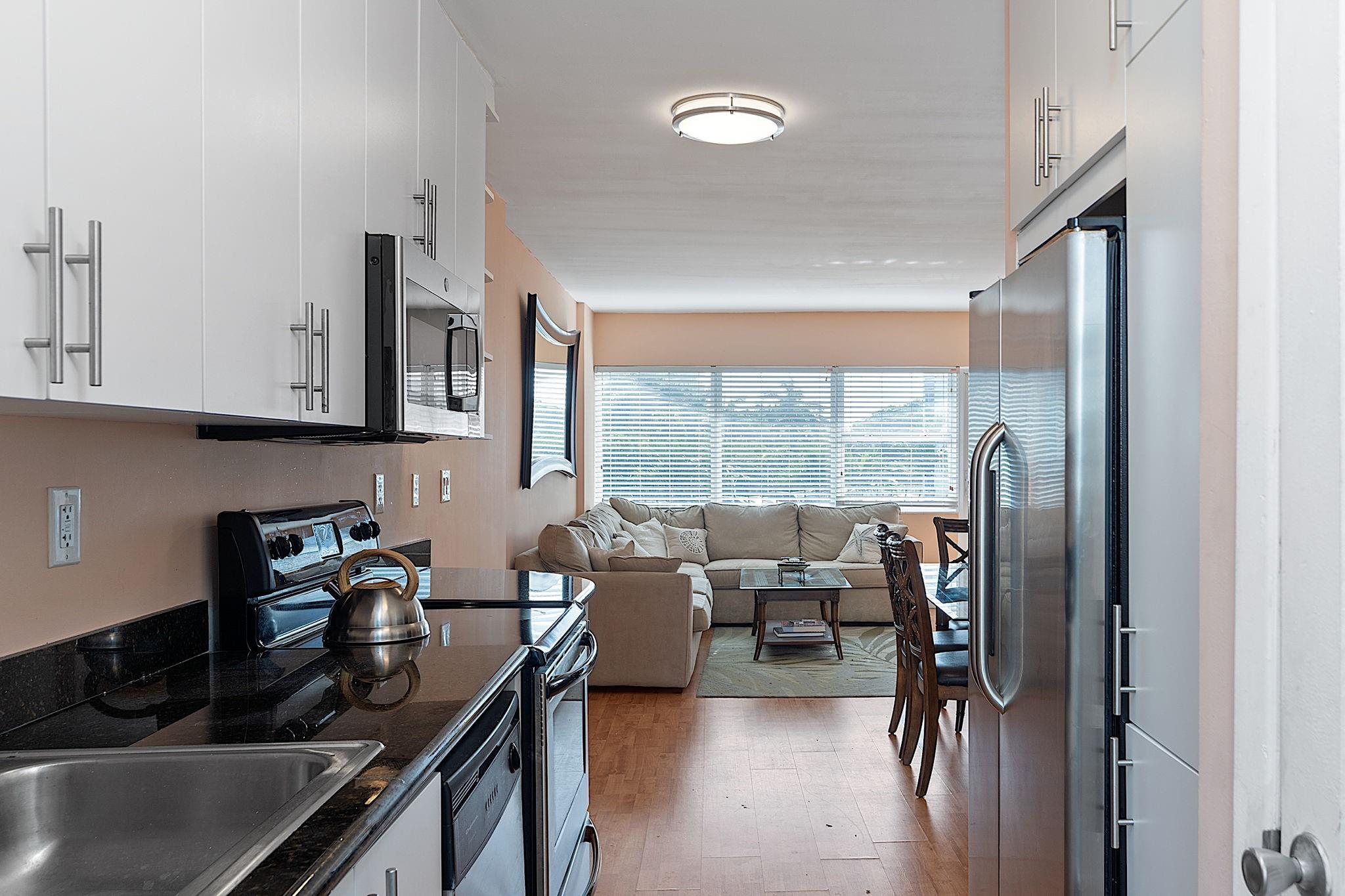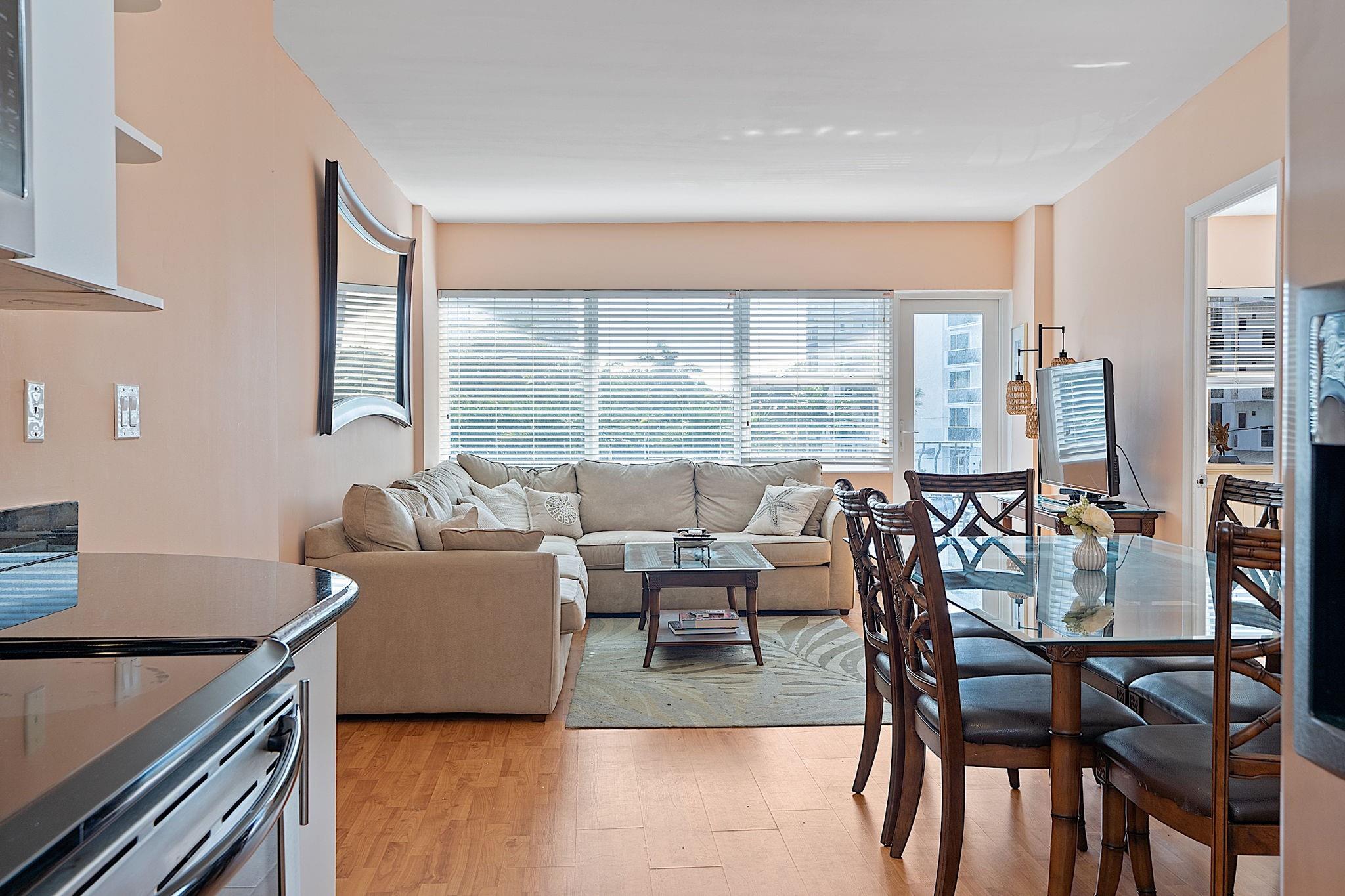 Great beach rental! LOCATION, LOCATION: 2 blocks from the beach, walk to restaurants, night life and shopping! 2 bedroom unit in Boutique condo, renovated lobby, management office on premises. Updated kitchen with granite countertops and S/S appliances. Bath includes granite top vanity and tumbled marble tiled shower. Laminate wood floors, light and bright decor. King bed and walk in closet in main bedroom, bunk beds in 2nd bedroom including a full and twin. Heated pool, outdoor BBQ area, outdoor shower, fitness center, lounge, security cameras, and furnished roof top sun deck. Great beach vibe, friendly building! Short term considered...