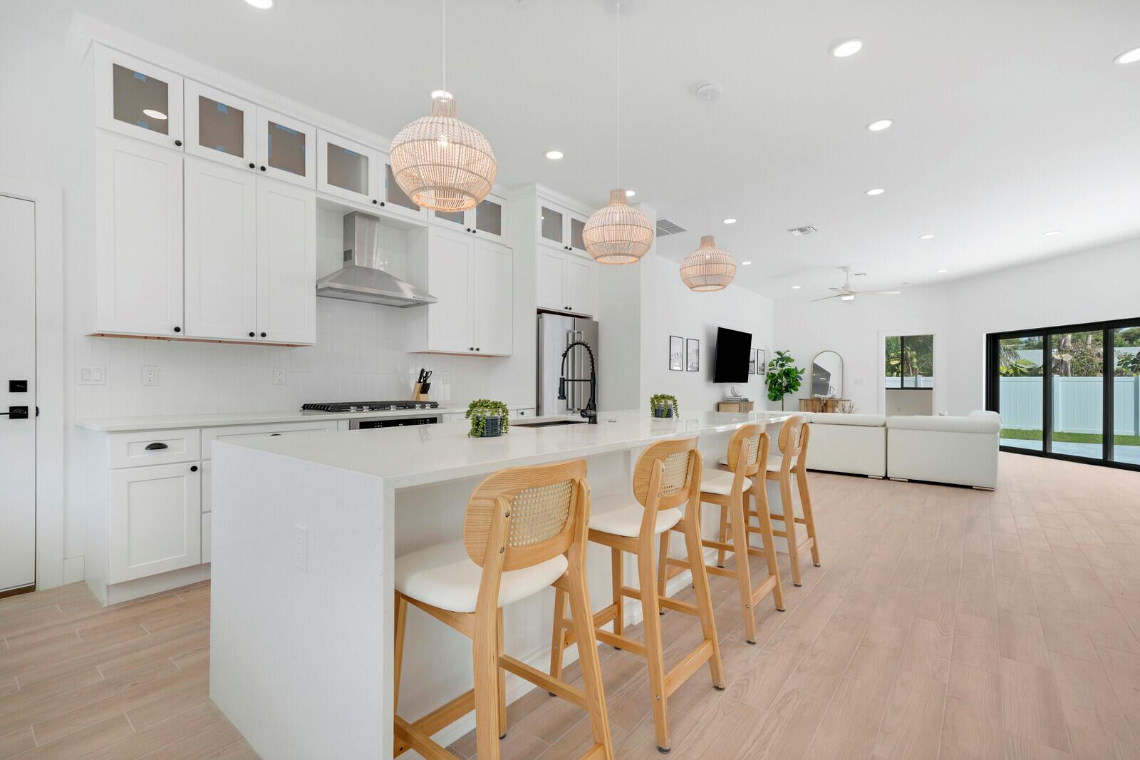 This stylish Singer Island retreat has welcomed celebrities, executives, and luxury travelers seeking the ultimate coastal escape. Just one block from the beach, this beautifully renovated 4-bedroom, 3.5-bathroom home offers over 2,000 square feet of thoughtfully curated living space. The split-bedroom floor plan ensures privacy, with a spacious primary suite on one side and three additional bedrooms on the other--perfect for families, guests, or a dedicated home office.The chef's kitchen boasts premium appliances, sleek finishes, and generous prep space--ideal for entertaining or relaxing nights in. Step outside into your private tropical haven, where a saltwater pool with a heater and a chiller awaits. Surrounded by a sun-soaked patio, it's the perfect spot to unwind under...