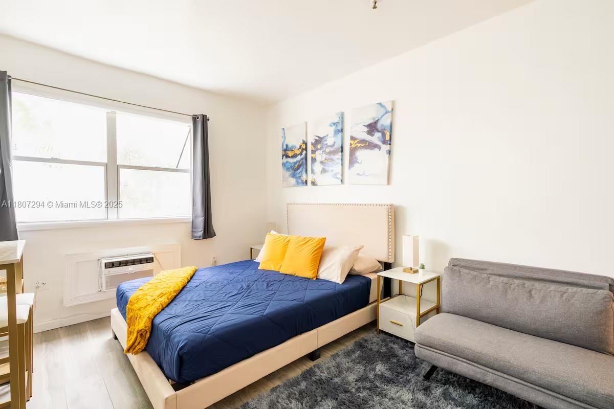 ONE BLOCK FROM THE BEACH! Short term & Long term, fully furnished rental in the center of Miami Beach. This charming studio was recently renovated with stylish new flooring and modern furniture, including a queen-sized bed, cozy couch, and sleek dining table with chairs. The kitchen is fully equipped with a refrigerator, microwave, electric plate (stove top), coffee maker, electric kettle, plates, glasses, cups, and a small blender for your convenience. The PRIVATE bathroom and bedroom are both stocked with fresh linens and towels. Available for both short-term and long-term rentals (1 month+).