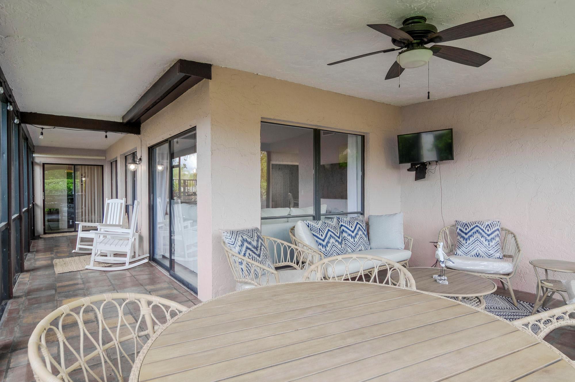 Available for off season, ($3,500/mo) and seasonal rent, ($7,500/mo) (4 month min) This beautifully renovated home is located on a large private corner lot featuring a wrap-around screen enclosed patio with a fenced in yard and privacy hedge overlooking green space. Off season and seasonal ONLY. NOT available for annual rent.The kitchen has been beautifully renovated with soft-close cabinetry and a designer backsplash. It also has Samsung Black Stainless Steel fingerprint resistant appliances less than 2 years old. The baths have been upgraded and updated with new cabinetry and quartz countertops. There are built-ins in the closets and the home has a large 2-car garage. It is just a short walk to the community pool.