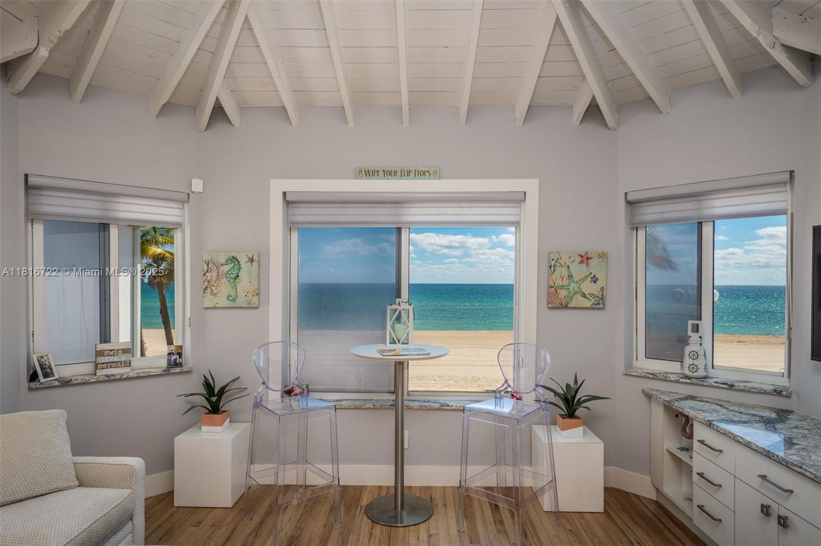 This rarely available 1 bed/ 1 bath furnished corner unit in boutique oceanfront building along the Hollywood Beach Broadwalk, is the perfect getaway. From the second you step through the front door you're mesmerized by the ocean views. Vaulted wood finished ceiling. Wood and tile flooring. Impact glass throughout. Washer/Dryer. Reserved parking spot.
