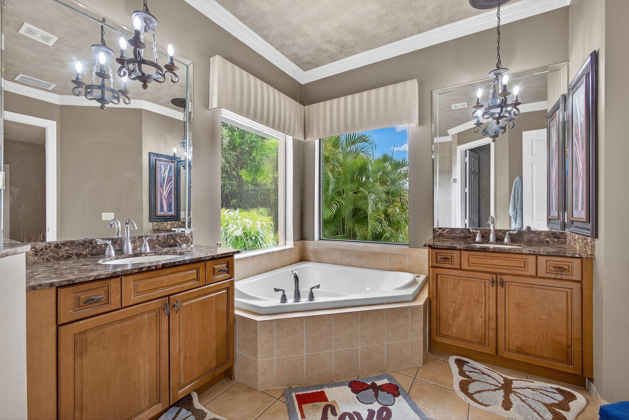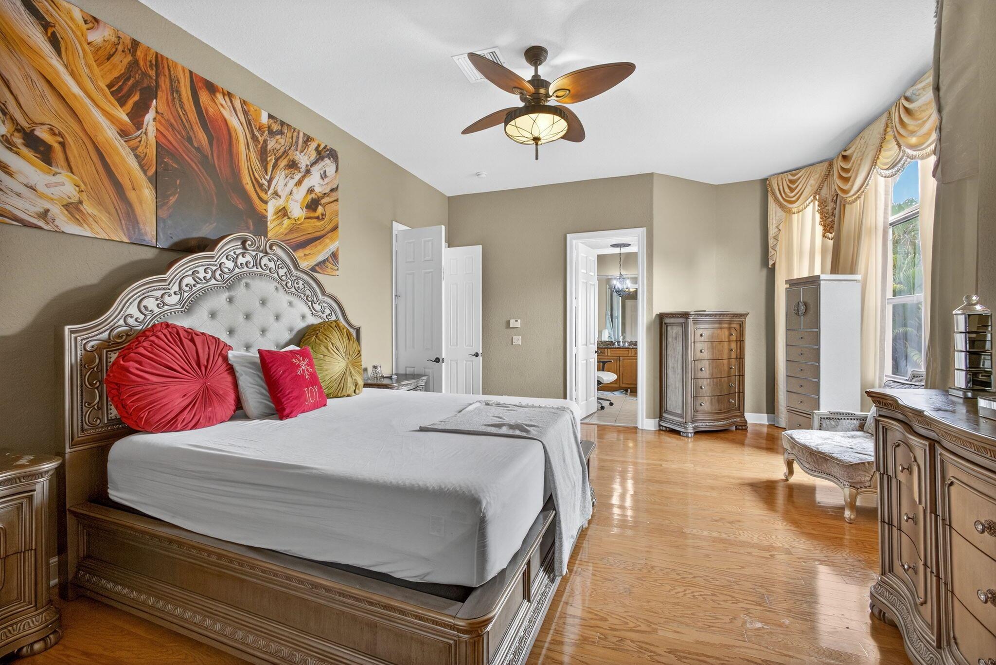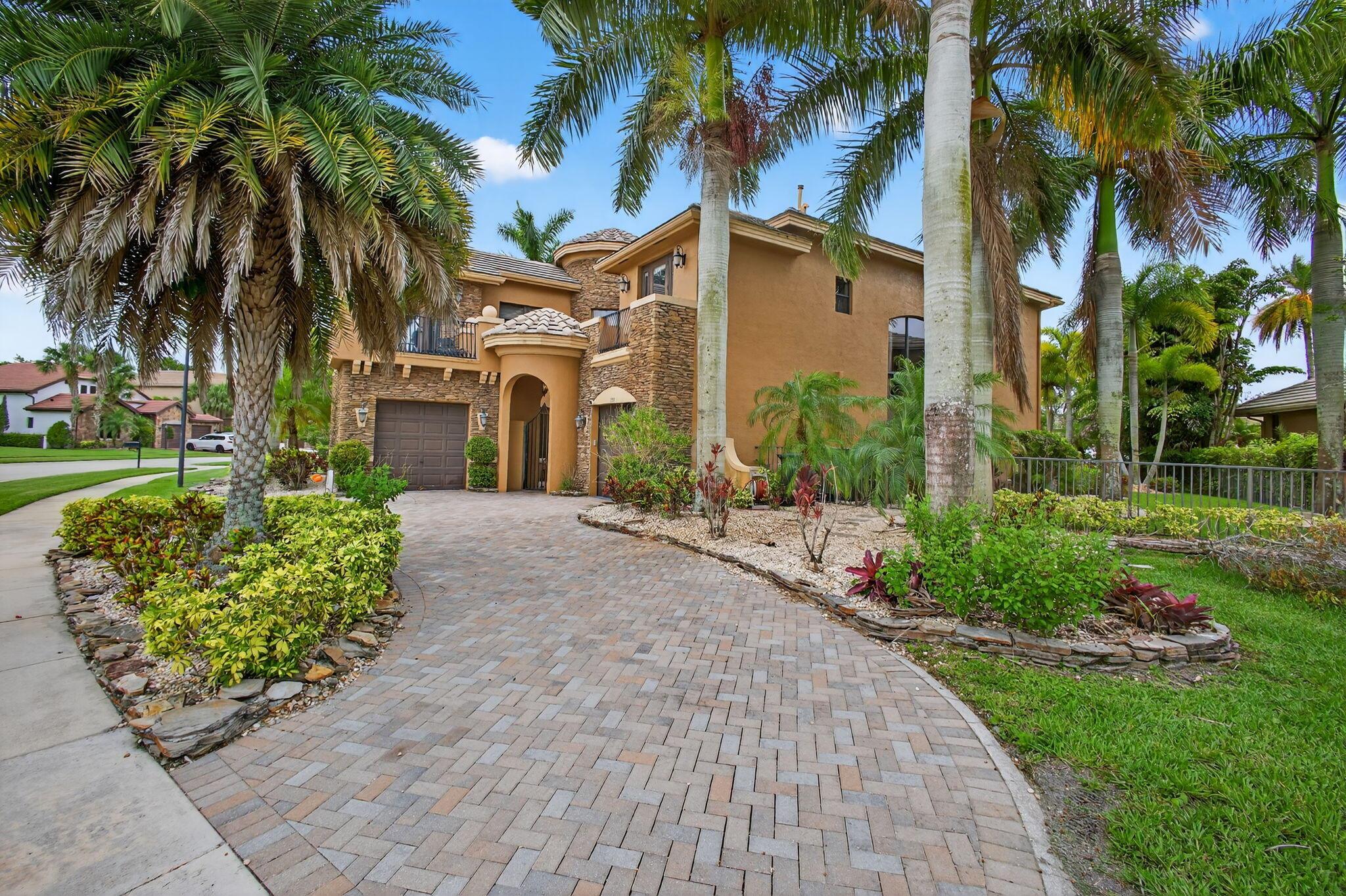 Experience luxury lakefront living in this highly desirable Moulin Rouge model, located within the prestigious, guard-gated Versailles community in the heart of Wellington. This expansive 4-bedroom, 4.5-bath pool home features a charming courtyard entrance, dual garages, and offers over 3,500 square feet of thoughtfully designed living space with an open layout ideal for both entertaining and everyday comfort.The gourmet kitchen is equipped with granite countertops, a center island, gas cooktop, double ovens, stainless steel appliances, and a dual sink with a window overlooking the backyard. Each bedroom features its own private en-suite bathroom and walk-in closet, with two bedrooms enjoying private walk-out balconies.