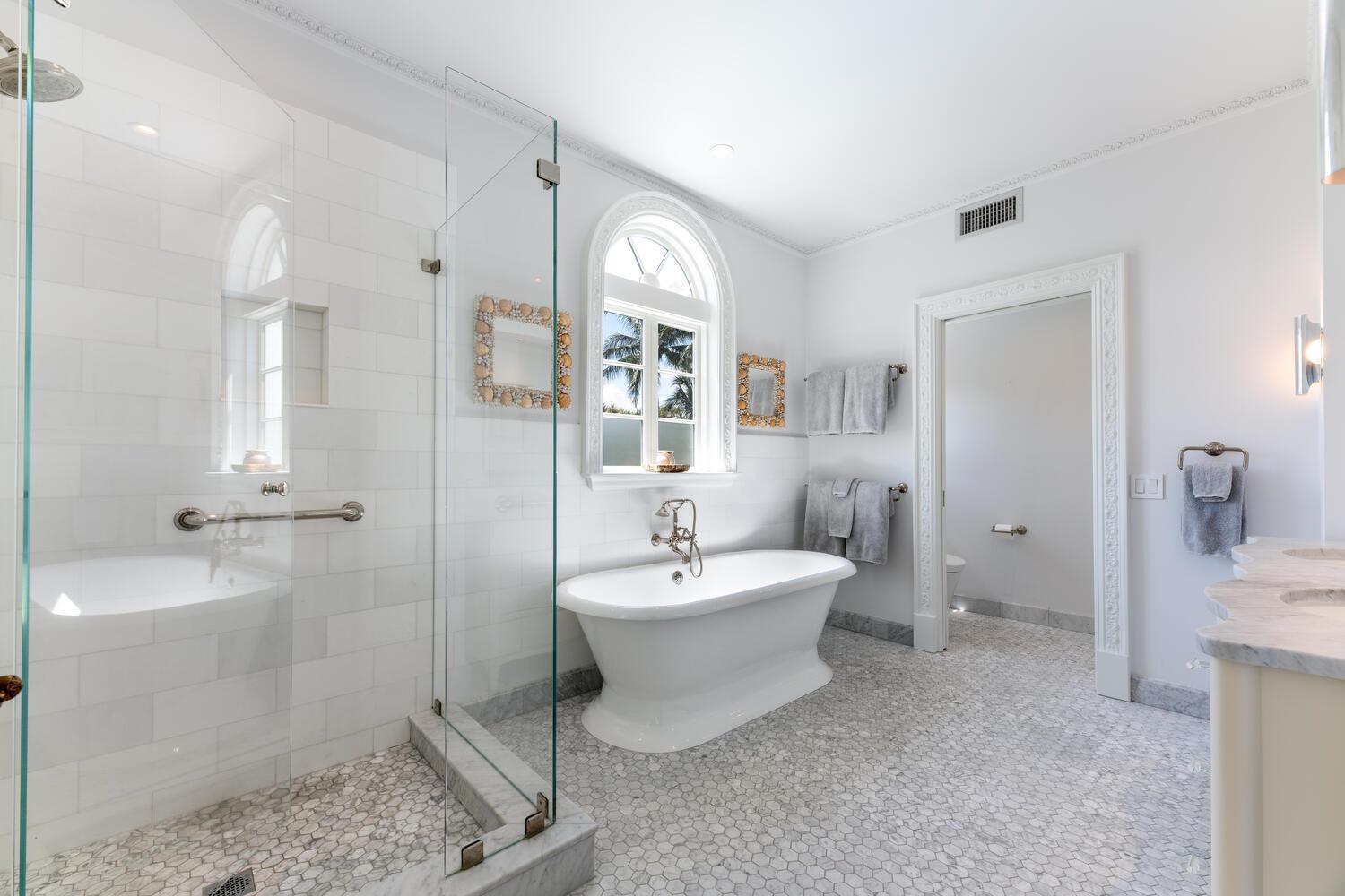 Exceptional Ocean Block Rental on Brazilian Ave. Just steps from the beach, Worth Avenue, and dining, this stunning property includes a 4-bedroom, 4.5-bath main house and a 2-bedroom, 2.5-bath guest house. The home is filled with exquisite architectural details and flooded with natural light. The main level features a grand double living room, formal dining area, library, and family room. The chef's kitchen is equipped with a Lacanche range and storage island. Soaring ceilings, light oak hardwood floors, an elevator, and gracefully curving staircases enhance the home's charm. French doors open to a coquina stone-covered patio and heated pool, surrounded by lush landscaping for ultimate privacy. Outdoor features include an outdoor shower, electric gate, and two car charging stations