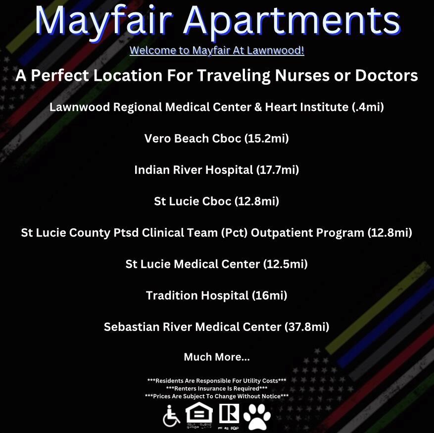 The Mayfair at Lawnwood Apartments, A Luxury Rental Community, is in a prime location these apartments provide easy access to the Lawnwood Medical Center, Indian River State College and FAU's Harbor Branch Oceanographic Institute as well as cultural and recreational amenities. Just minutes away from the beach & downtown Fort Pierce. The apartments feature high-end finishes, sleek kitchens with modern appliances, and spacious bedrooms, large walk-in closets, and large bathrooms creating a sophisticated and comfortable environment for residents.Tours Available Now By Appointment Only.