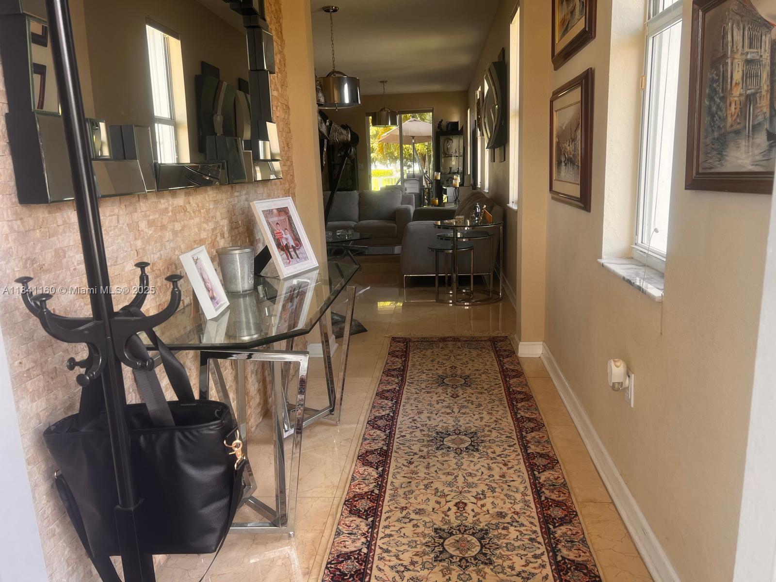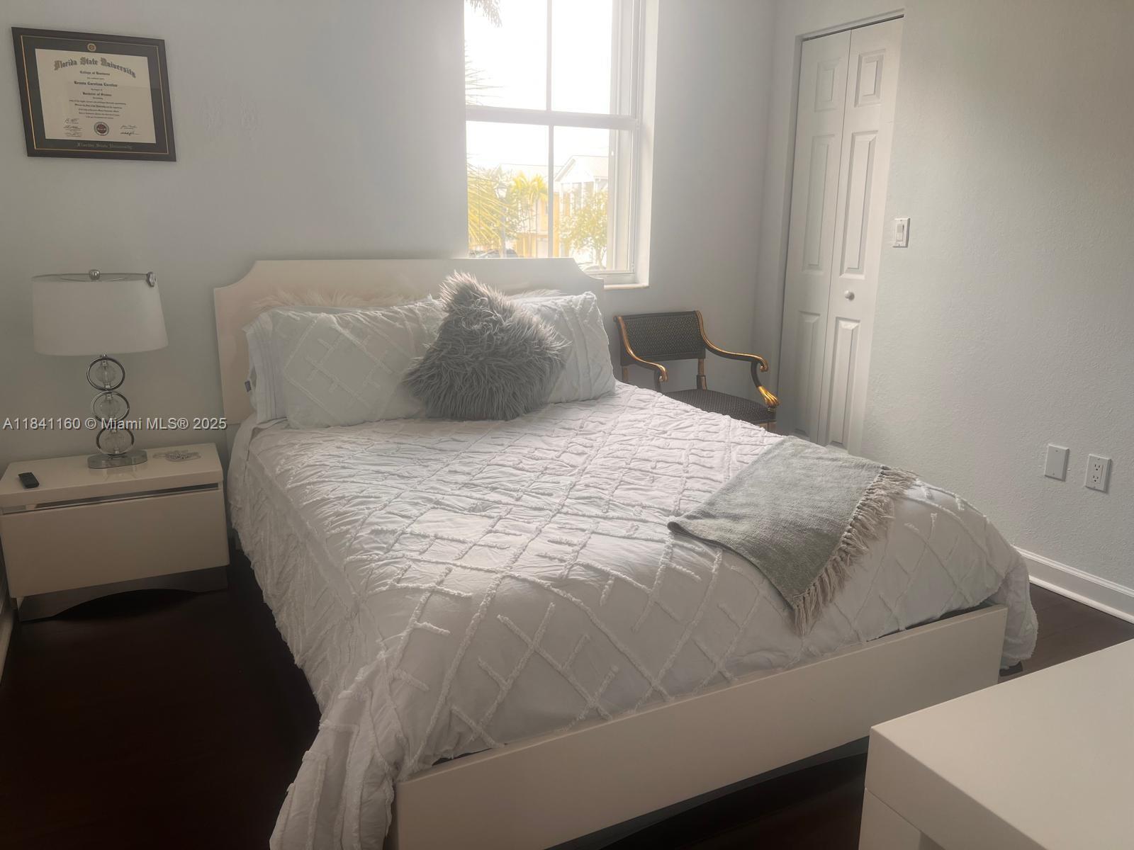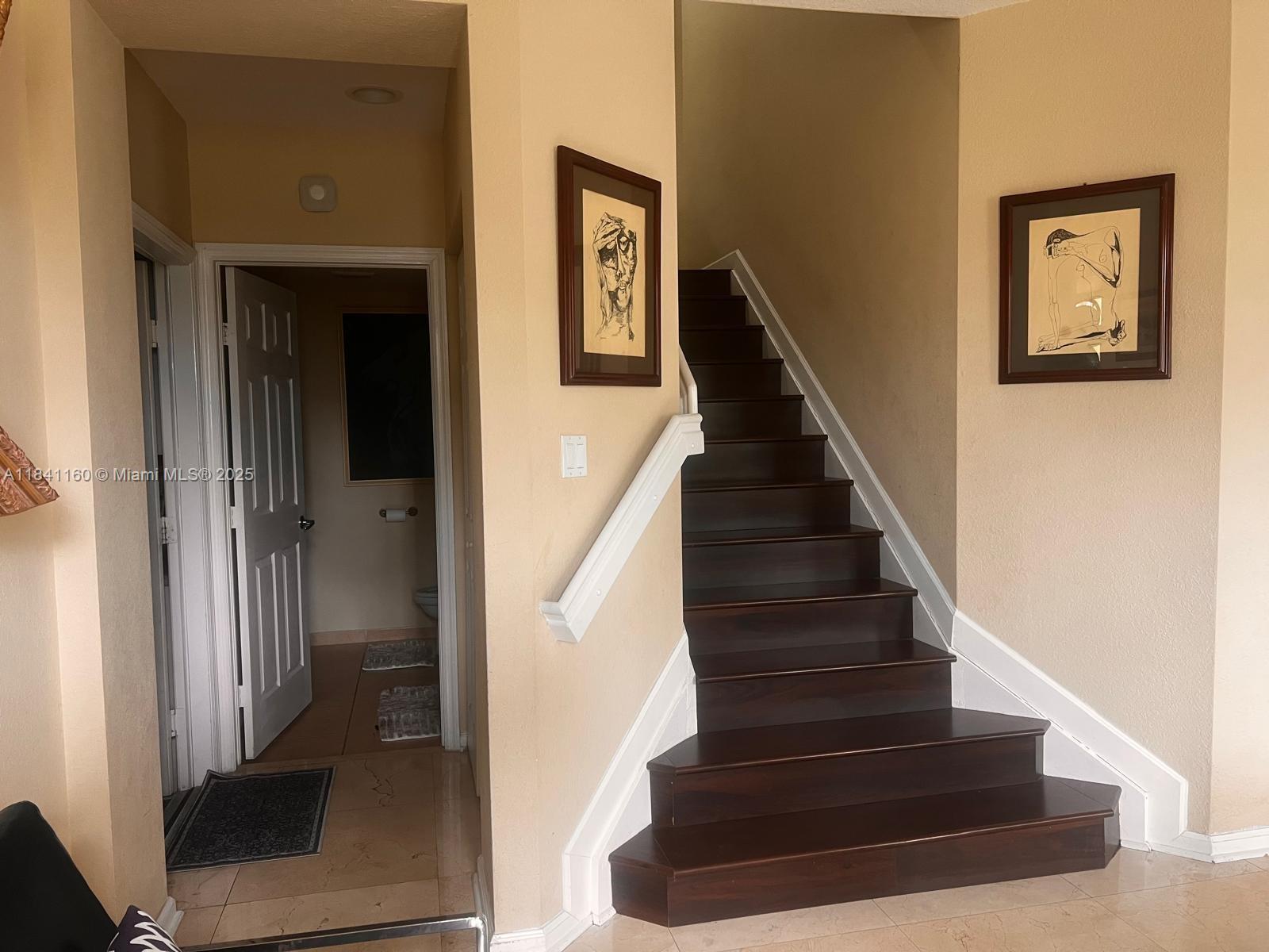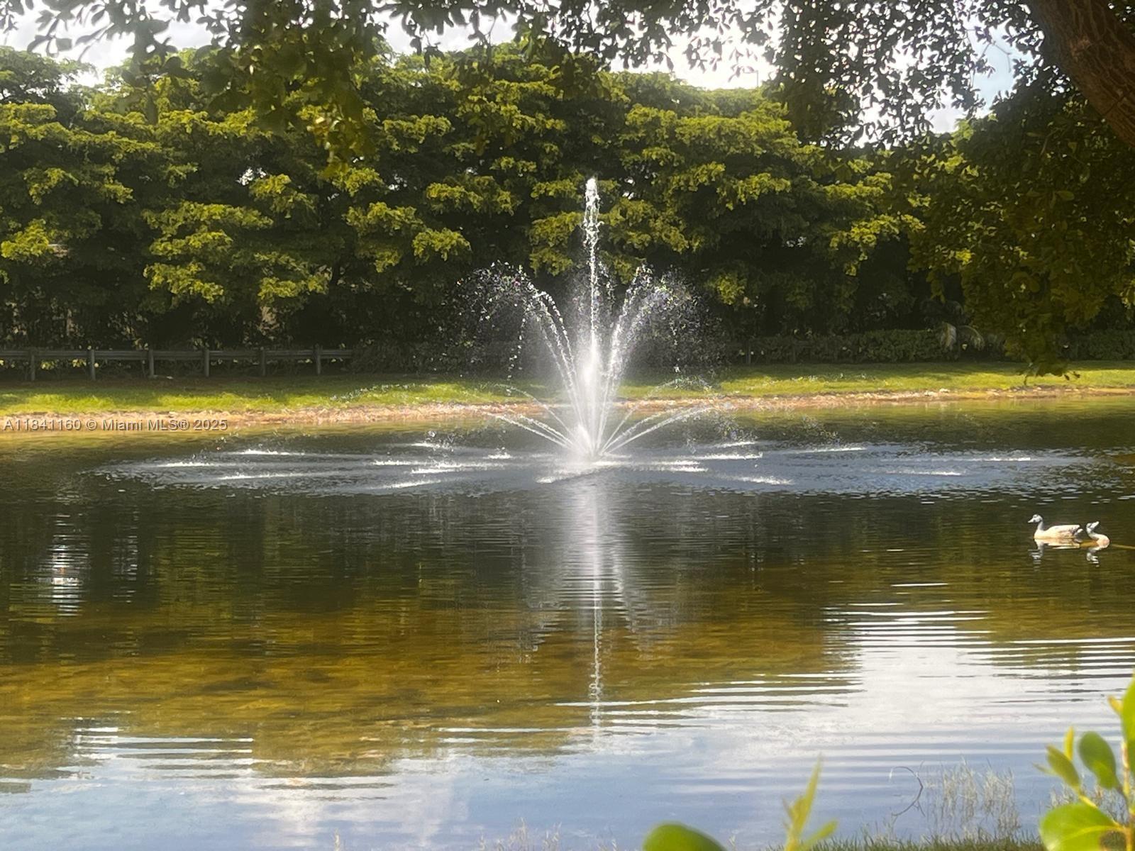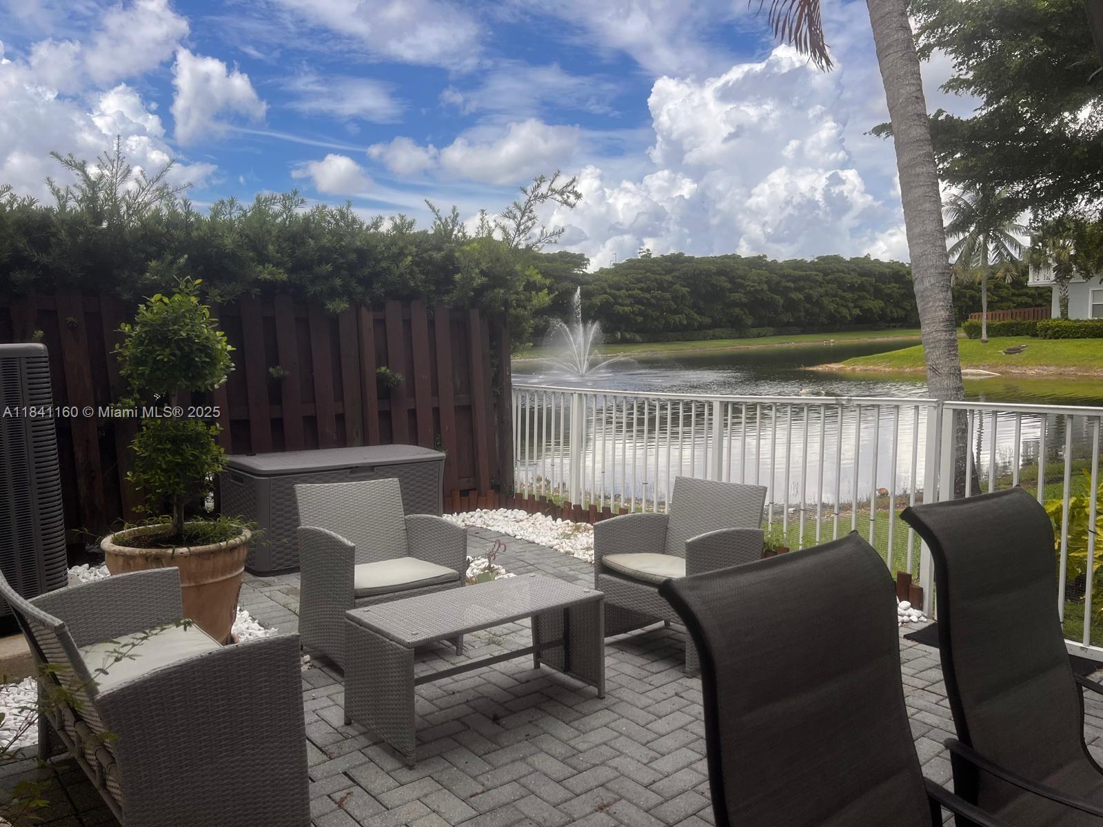 Beautiful and spacious corner townhouse with 4 bedrooms and 3.5 bathrooms, located in a secure gated communiety. Enjoy added privacy with only one direct neighbor. The first floor features elegant marble flooring, while the second level boasts warm wood floors. The master bedroom includes a private terrace with breathtaking view of the lake and the community playground. The backyard is perfect for relaxing or entertaining, featuring a peaceful illuminated fountain and stunning lake views. This unique home offers the perfect combination of comfort, style an serenity. Five cars can be parked on the property. Two inside, two outside, and one across.