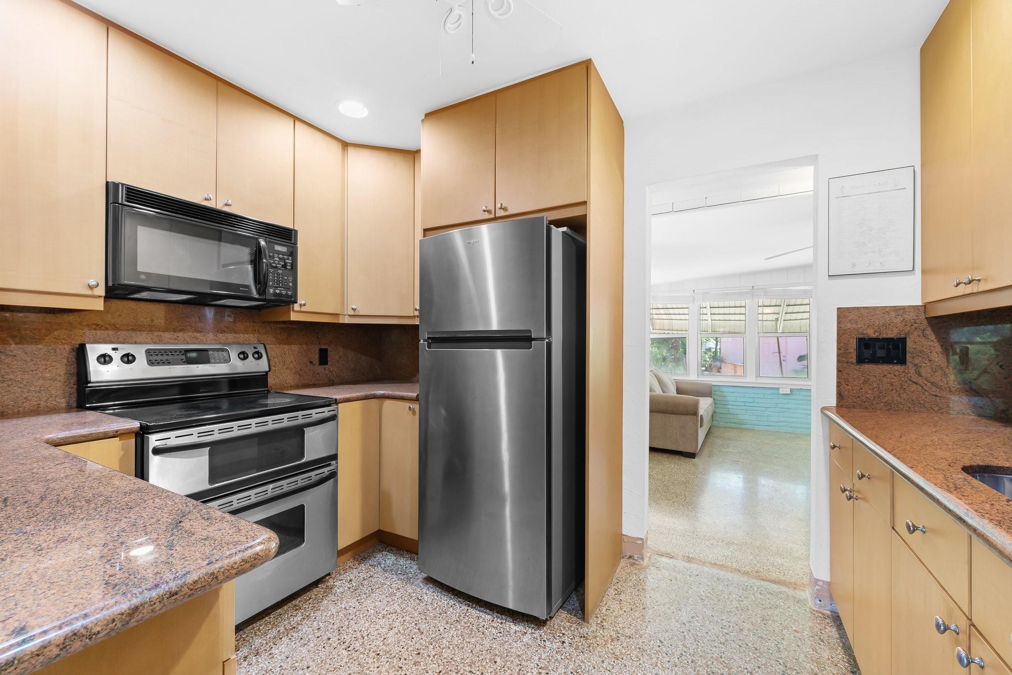 Updated 3-Bedroom Home on Corner Lot in East Ft. Lauderdale, with a new roof. Move-in ready with a blend of charm and modern upgrades! This 3-bedroom, 1-bath home features an updated bathroom and kitchen, complete with double ovens, stainless steel appliances, granite countertops, and abundant cabinetry. The open living/dining area flows into a bright Florida room, with original terrazzo floors throughout. Enjoy outdoor living in the private, fenced backyard, BBQ/grill and patio area, and an in-ground fish pond. Detached garage includes electric, water, and laundry hookups—perfect for a workshop or additional utility space. The property also features a well water sprinkler/pump system. A truly unique home with a warm cottage feel in a highly desirable East Fort Lauderdale location!