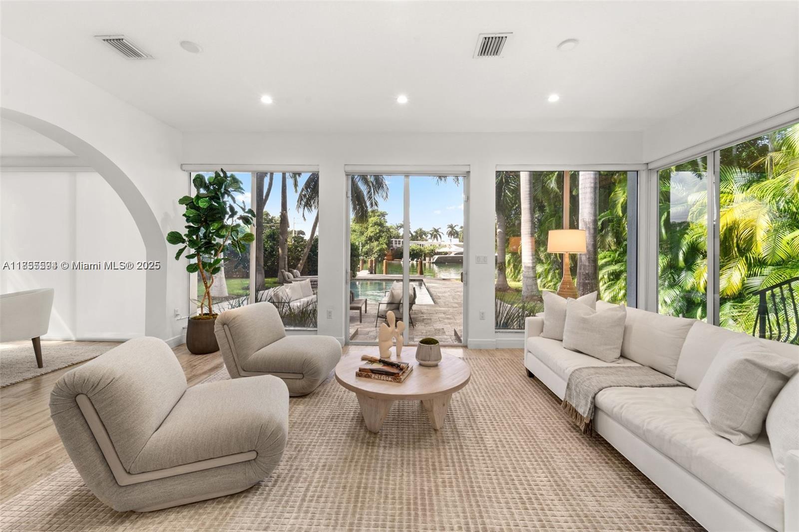 Nestled in the exclusive, guard-gated Allison Island community, this stunning waterfront estate offers luxury elegance. This two-story home features 5 bedrooms, 4.5 bathrooms, soaring ceilings, and abundant natural light. The gourmet kitchen boasts granite countertops, stainless steel appliances, a Sub-Zero fridge, and a gas-powered Viking stove. Designed for comfort and security, it includes built-in closets, impact doors/windows, a generator, and security system. A separate guest house adds 1 bed, 1 bath, a mini kitchen, and a Tesla-charger garage. Outdoors, enjoy a lush backyard with a pool, built-in BBQ, 75 feet of water frontage, a dock, and an electric boat lift up to 10,000 lb , offering direct bay access. Allison Island Association has approved plans for renovated guard gate.