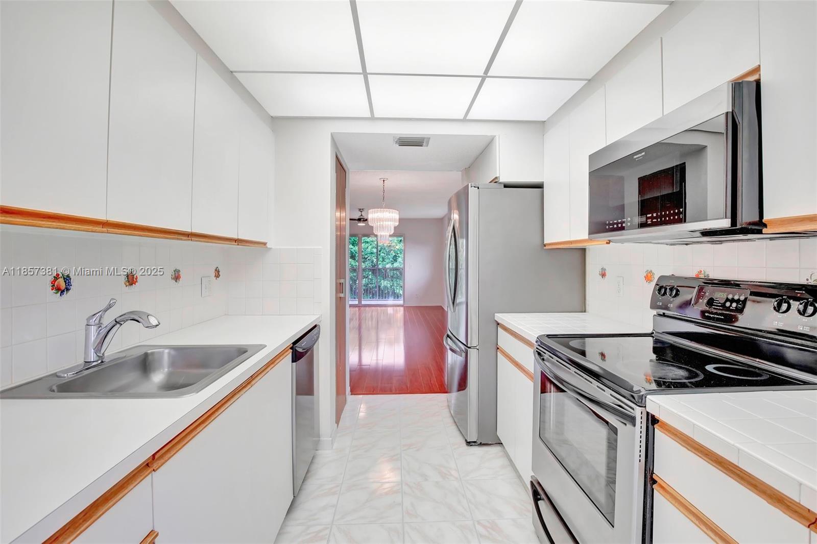 55 and older community with includes cable,internet,water,and trash. Top-floor corner unit and a breathtaking golf view with 1,507 SQ.FT. a well-maintained interior, complete with attic access through the master bedroom closet and a convenient shower bathroom. The kitchen features pull-out drawers for easy access, stainless steel appliances including a French door refrigerator and wood flooring with a high-quality finish. With hurricane impact windows and accordion shutters on the patio, peace and security are ensured, allowing for uninterrupted enjoyment of the breathtaking golf course views. Enjoy Resort-style living with a clubhouse, movies, fitness center, transportation, free golf, pharmacy, cafe, 24-hour security patrol.