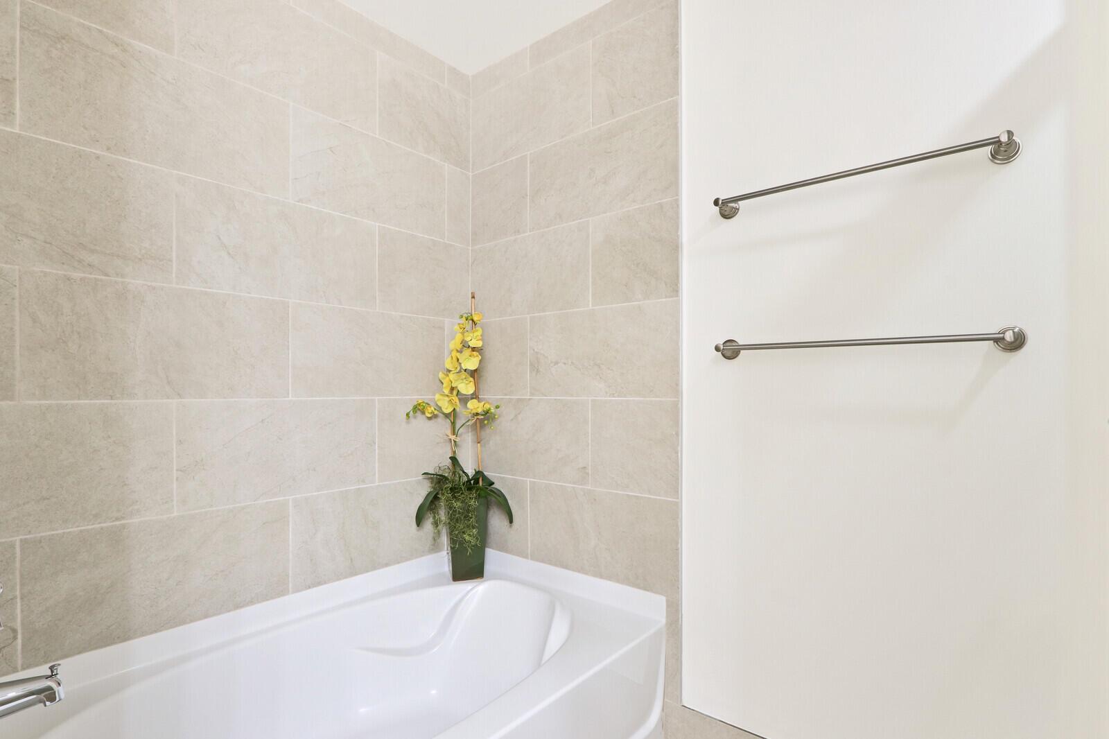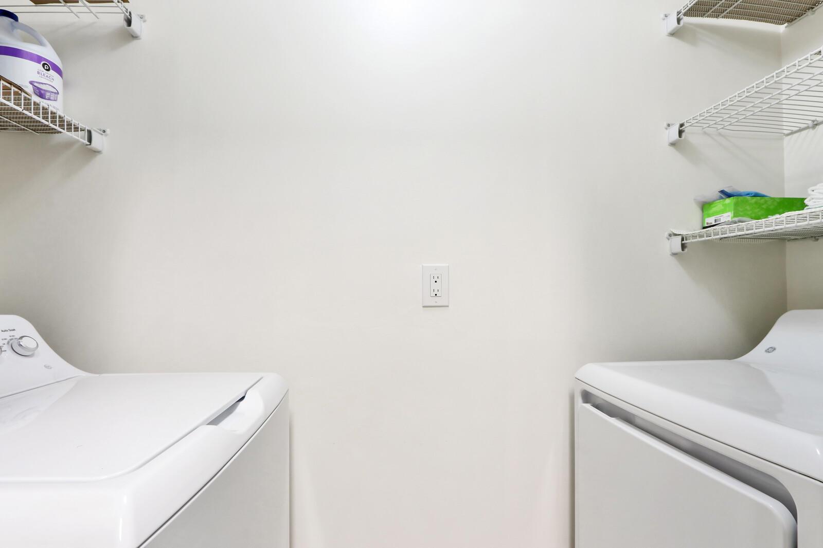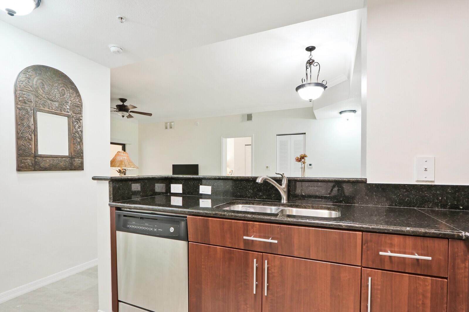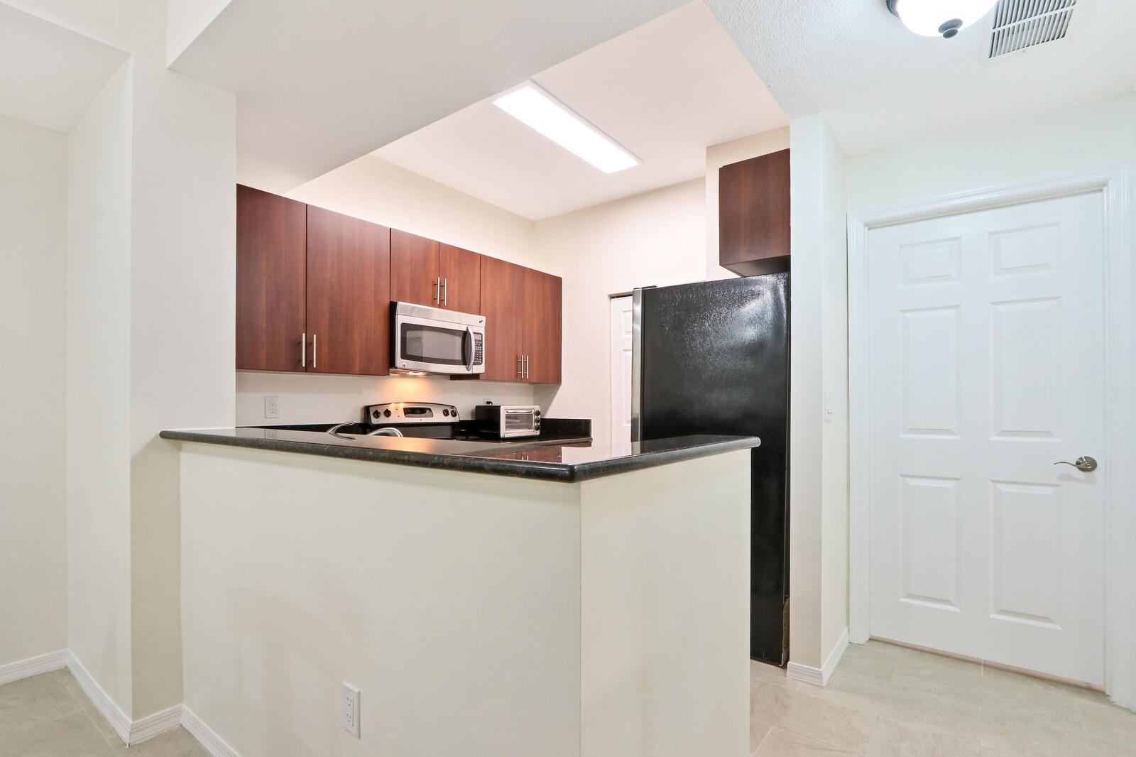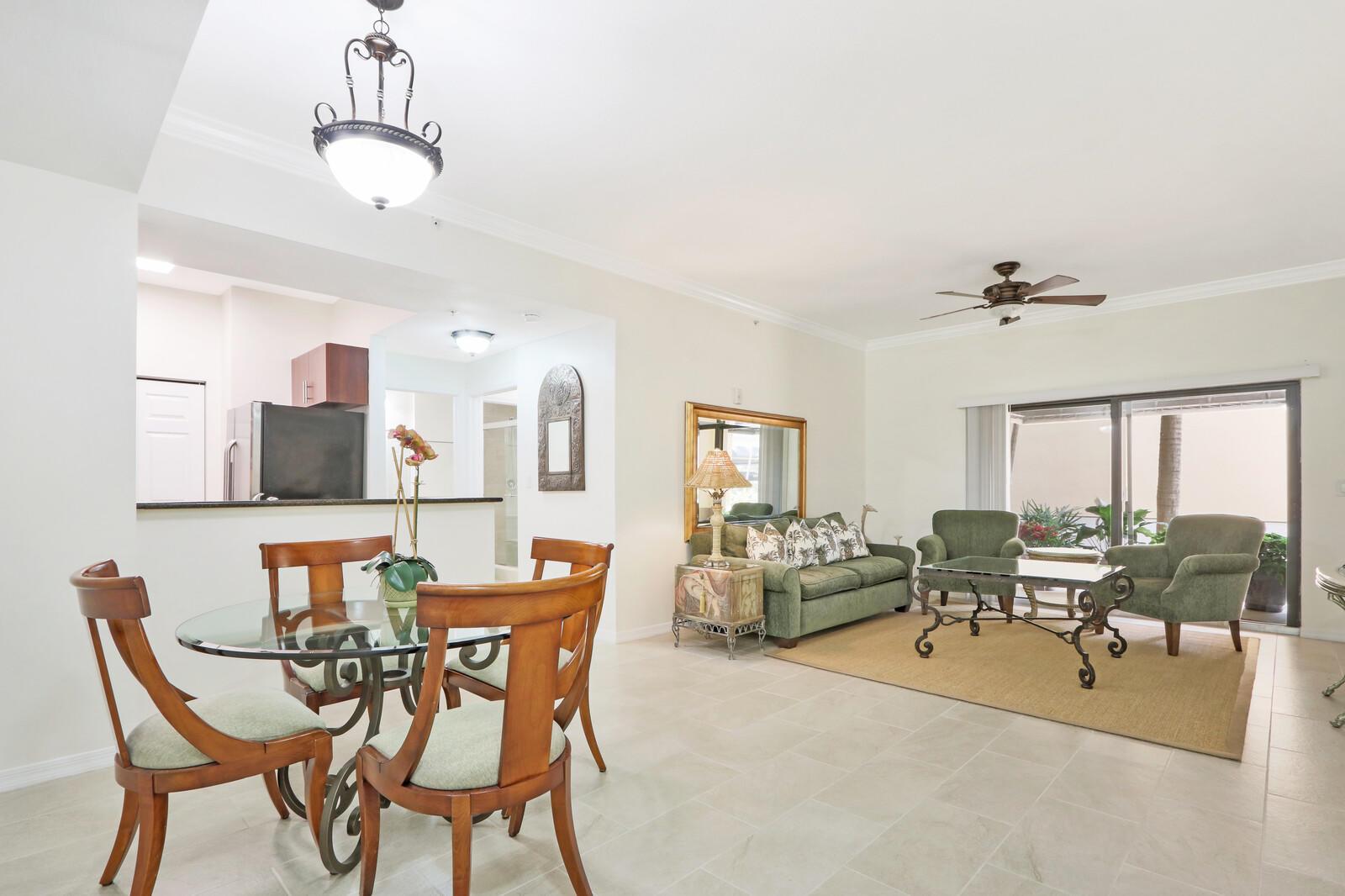 Spacious tastefully furnished 2 bedroom condo overlooking tropical courtyard. Two assigned parking spaces, one steps away in the covered garage. Ceiling fans, crown molding and impact windows. Updated tile floors throughout the unit. Open kitchen with granite counters and stainless steel appliances. Inside laundry room with washer/dryer. Unit is on the first floor for easy access. Large TVs in Living Room and Master. Master Bath has separate shower, large tub and two sinks. Second bath has shower. Midtown amenities include a beautiful clubhouse, with gym, business center, heated pool/spa and pickleball/tennis court. All of this in a secure gated building close to I-95 and the Turnpike. Walking distance to restaurants, grocery stores and the shops of Midtown.
