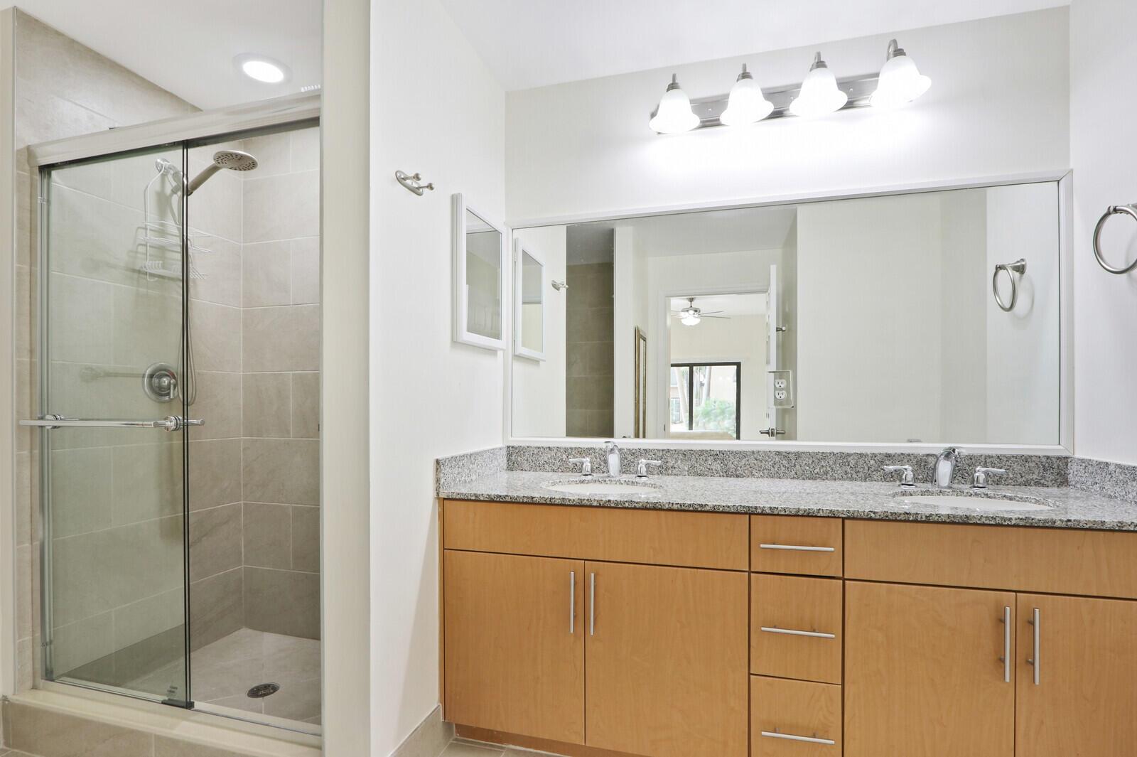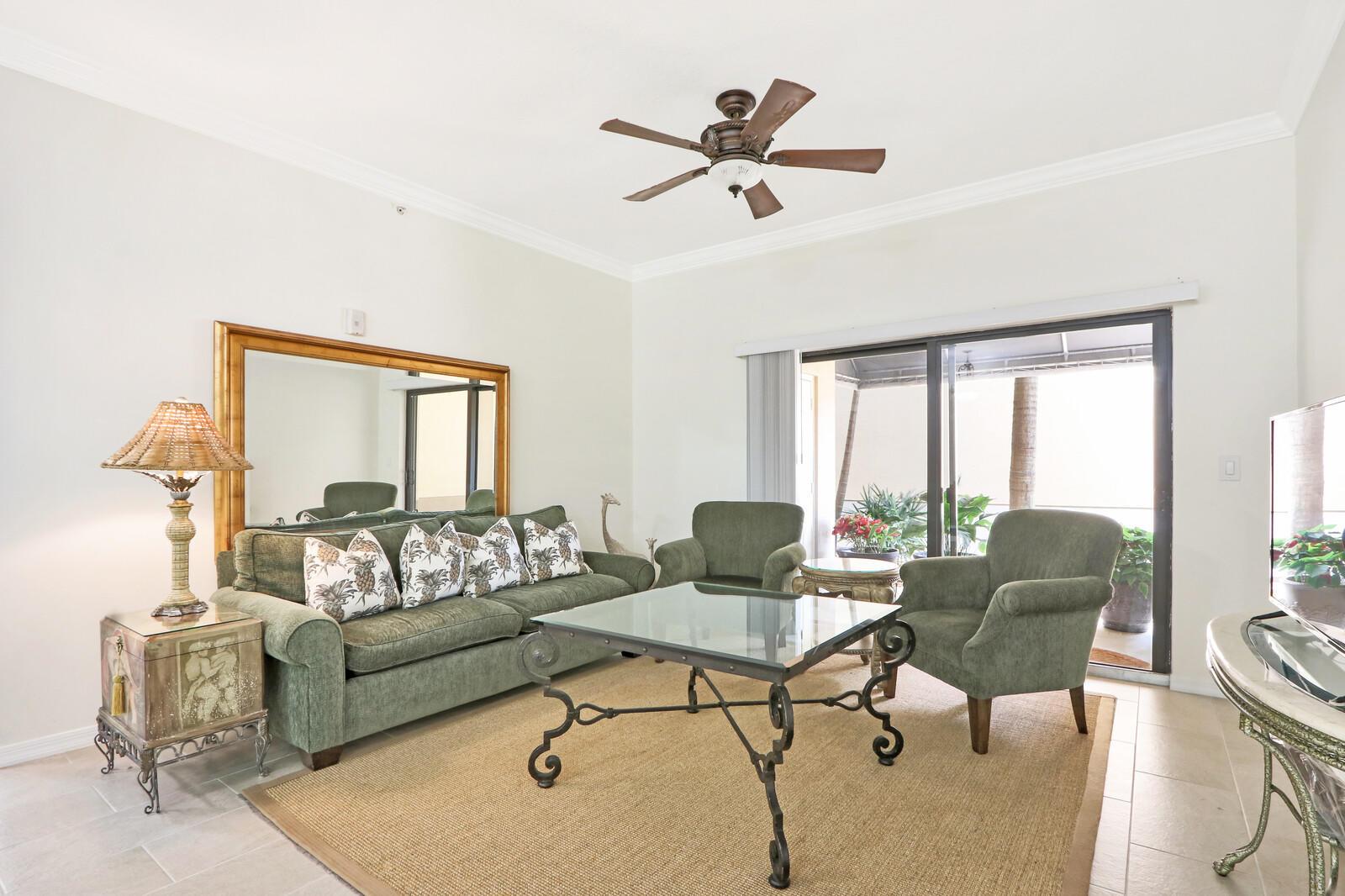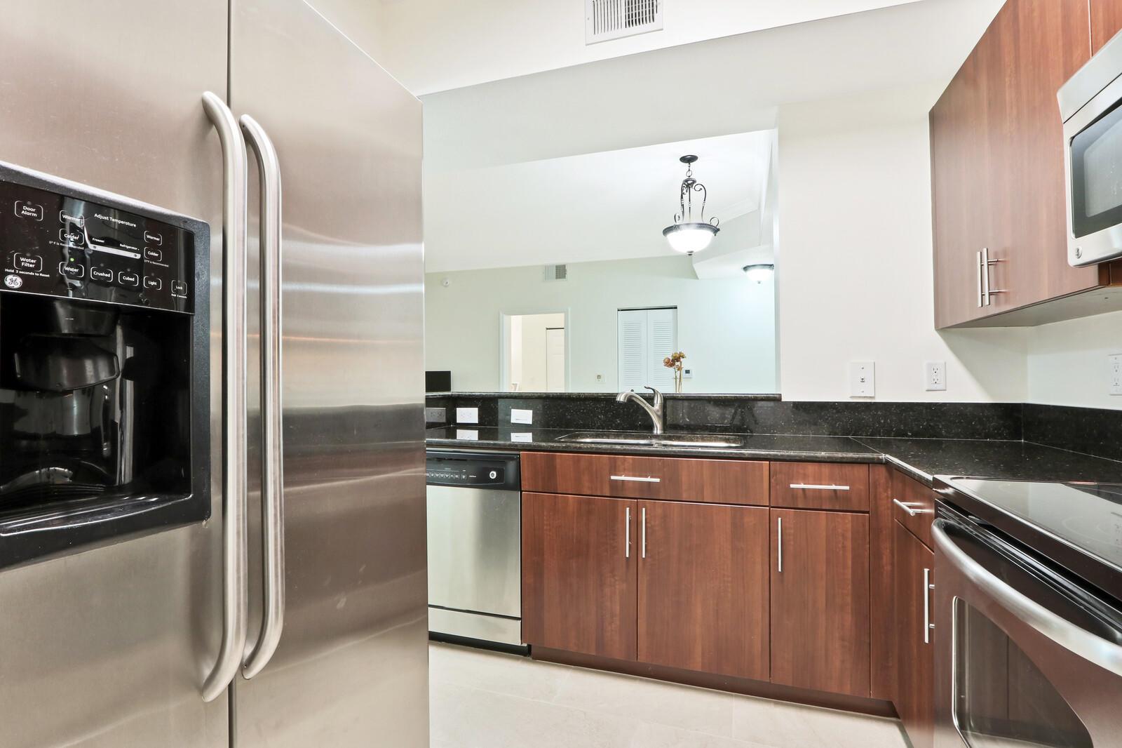 Beautiful split plan 2 bedroom condo, with a covered parking space in the garage steps away from the unit. Additional outside parking space. Ceiling fans, crown molding and impact windows. All tile floors, Kitchen has granite counters and stainless steel appliances. Unit is on the first floor for easy access and faces the tropical courtyard. Master Bedroom has a Queen size bed. Large TVs in Living Room and Master. Master Bath has separate shower and tub and two sinks. Second bath has large shower. Midtown has a beautiful clubhouse, with exercise room, business center, heated pool/spa and tennis courts. All of this is a secure gated building close to restaurants, groceries, I-95 and the Turnpike.
