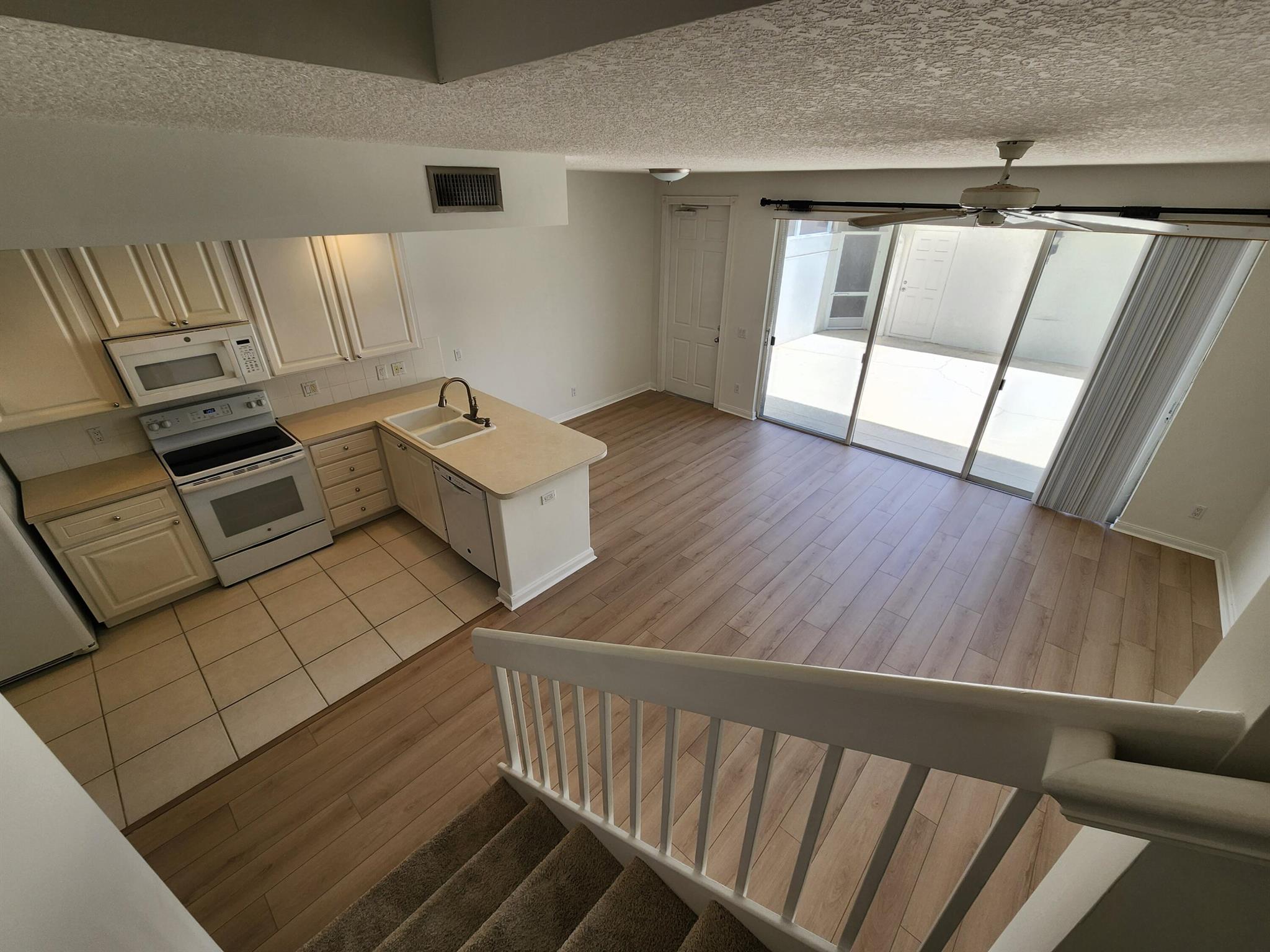 Welcome to this inviting 3 bed, 3 bath, 2-story townhouse located in the desirable Martinique community of Abacoa. Situated as an end unit, this home offers ample green space in the rear and side yards, plus, two front porches, providing a private and tranquil setting. Upon entering, you are greeted by a bright and open floor plan featuring high ceilings and a freshly painted interior. The first floor encompasses an adaptable space with brand new wood flooring throughout, complemented by a full bath nearby. The spacious living area seamlessly flows into the dining and kitchen areas, perfect for both casual family meals and entertaining. Step outside to enjoy the screened-in lanai, ideal for year-round entertaining and relaxation. Brand new roof installed 2024.