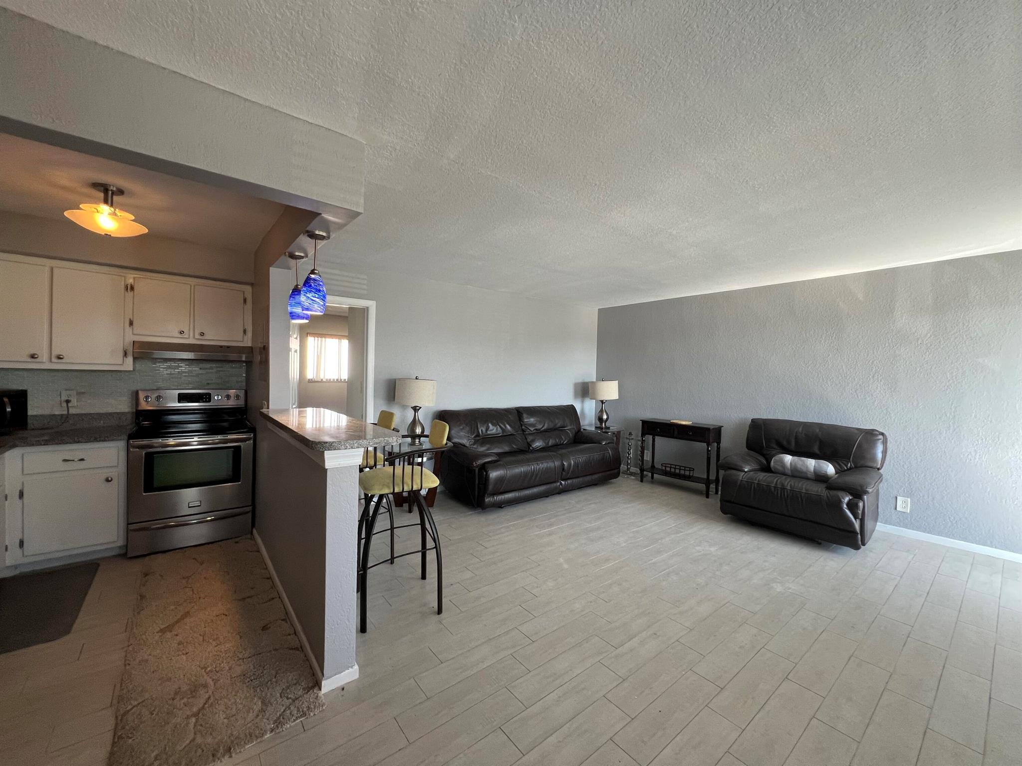 Large one bedroom apartment sitting on the Earman Canal. Large living room and bedroom with walk in closet and extra closet space. Stainless steel appliances included microwave. Kitchen counter space for bar stools. Tile shower, no tub. Wall A/C units. Dining area. Shared Laundry facility. Boat dock on property. One designated parking and guest parking. 1 yr Lease.